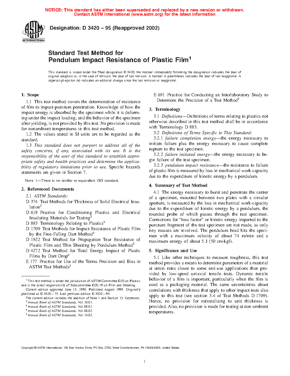 Several impact test methods are used for film. It is sometimes desirable to know the relationships among test results derived by different methods. A study was conducted in which four films made from two resins (polypropylene and linear low-density polyethylene), with two film thicknesses for each resin, were impacted using Test Methods D 1709