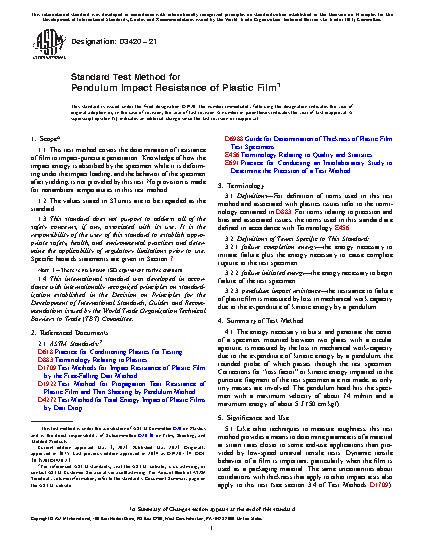 1.1 This test method covers the determination of resistance of film to impact-puncture penetration. Knowledge of how the impact energy is absorbed by the specimen while it is deforming under the impact loading, and the behavior of the specimen after yielding, is not provided by this test. No provision is made for nonambient temperatures in this test method.