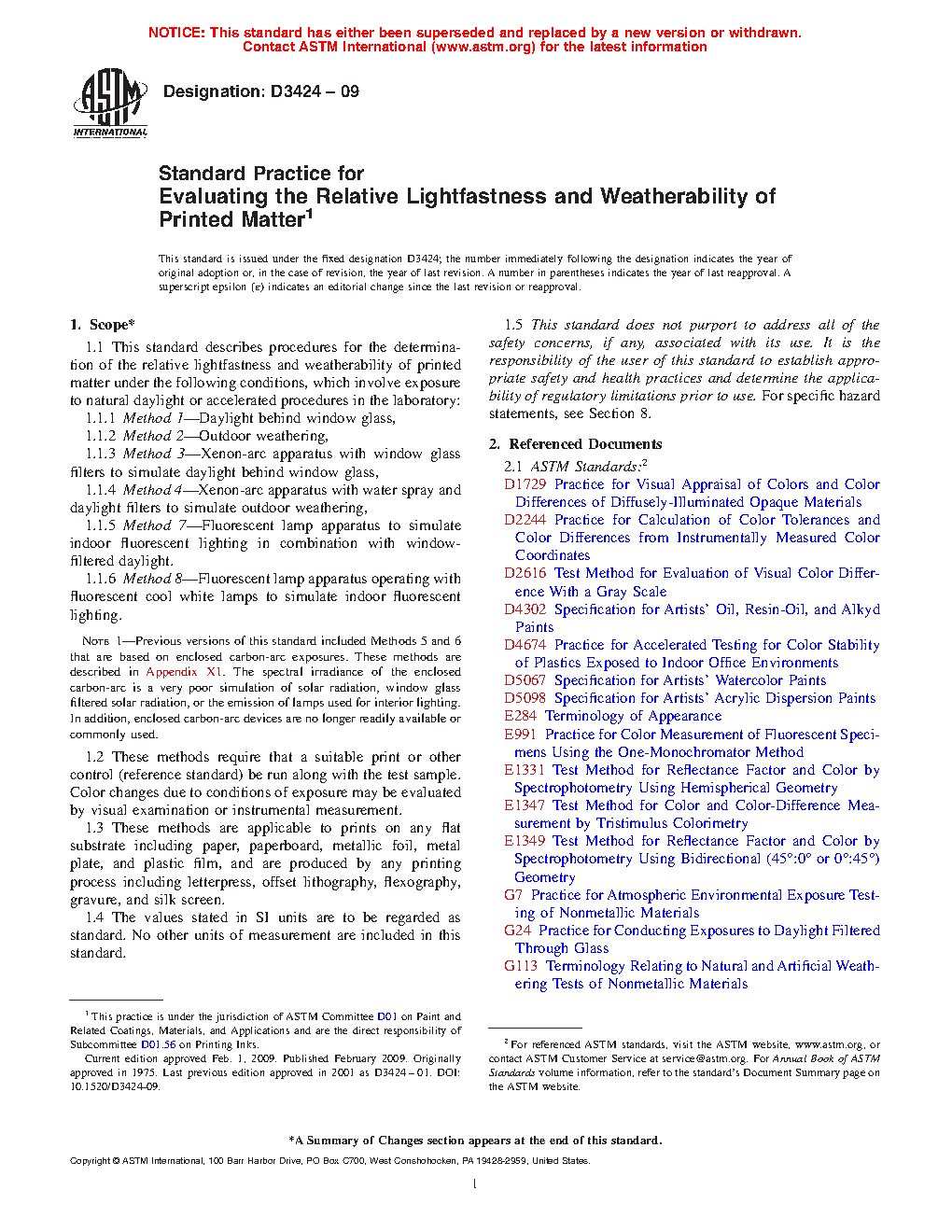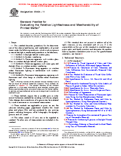 1.1 This standard describes procedures for the determination of the relative lightfastness and weatherability of printed matter under the following conditions, which involve exposure to natural daylight or accelerated procedures in the laboratory: