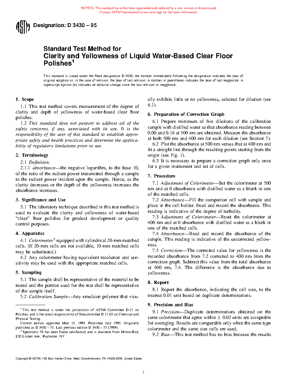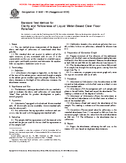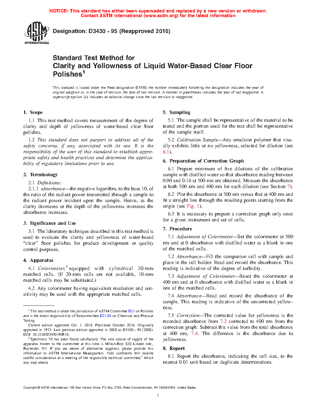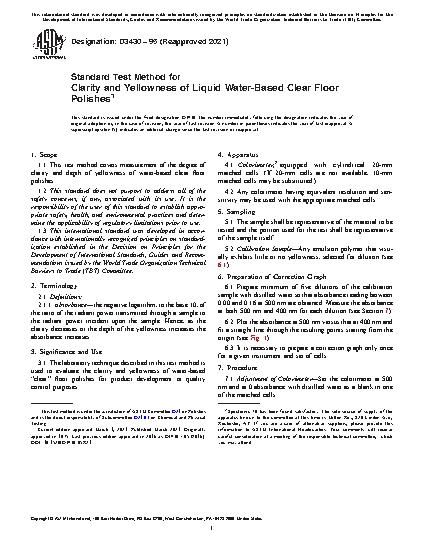 1.1 This test method covers measurement of the degree of clarity and depth of yellowness of water-based clear floor polishes.