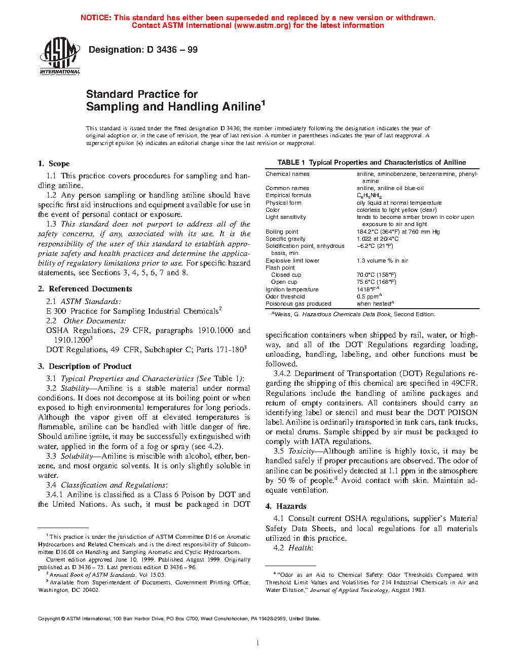 Standard Practice for Sampling and Handling Aniline (Withdrawn 2005)