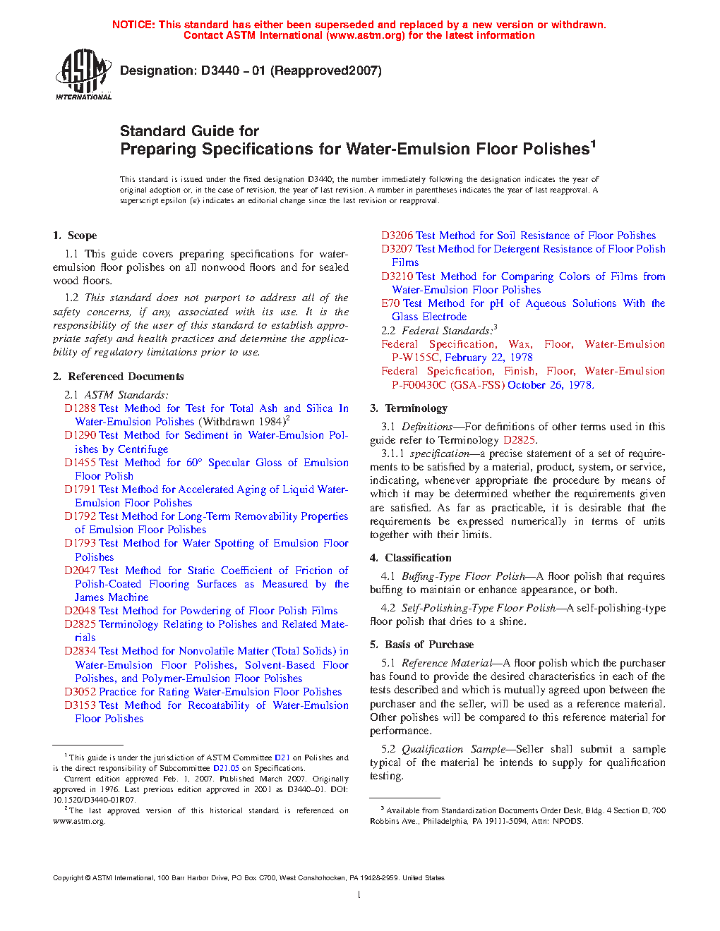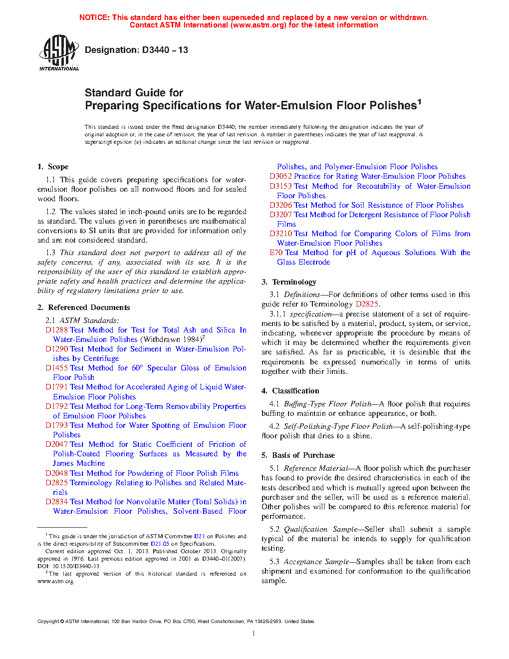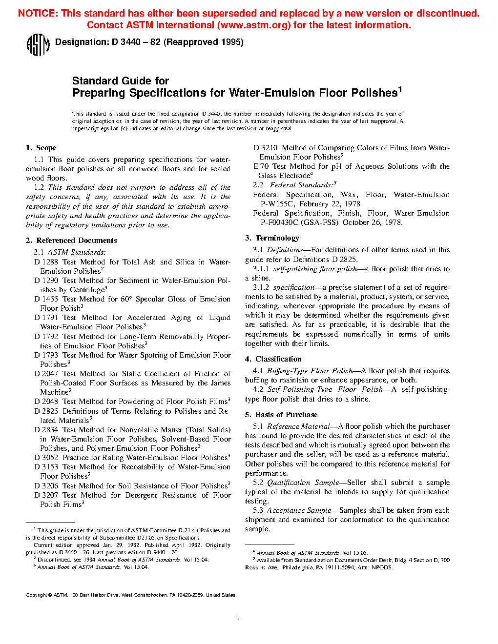 This guide covers preparing specifications for water-emulsion floor polishes on all non-wood floors and for sealed wood floors. The two types of floor polish covered are the Buff?ng-Type Floor Polish and the Self-Polishing-Type Floor Polish. The floor polishes shall be tested using infrared spectroscopy and gas chromatography; and the individual grades shall conform to specified values of color, total solids, sediment, alkalinity, stability, odor, and total ash and silica. The performance test includes performance, removability, resistance to soiling, water spotting, recoatability, powdering, static coefficient of friction, detergent resistance, and gloss.
