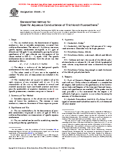 1.1 This test method covers the determination of aqueous conductivity due to ionizable contaminants extracted from trichlorotrifluoroethane. The value of 1.9 µS/cm as maximum specific aqueous conductance corresponds to 0.1 ppm of chloride ion (100 ppb). It was calculated by putting the solvent specification of 0.1 ppm chloride into the equation of the subject method to find C2 - C1 equals 19.08. The specific conductance due to contaminants from the solvent was then calculated as follows: