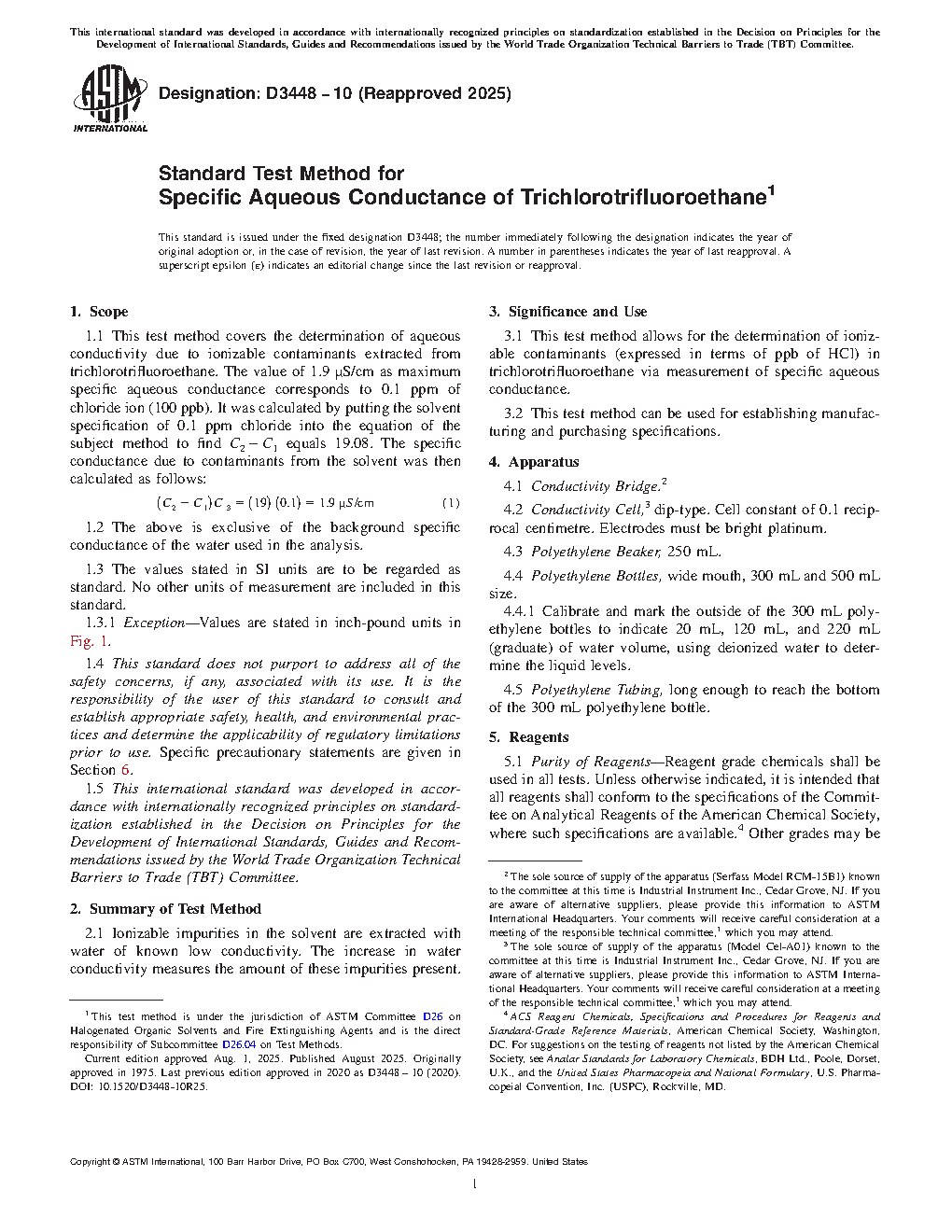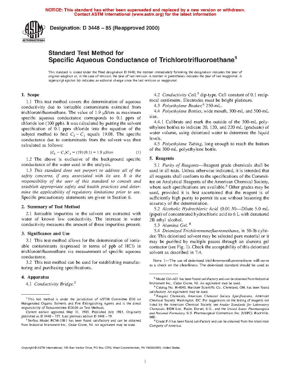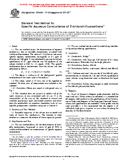 3.1 This test method allows for the determination of ionizable contaminants (expressed in terms of ppb of HCl) in trichlorotrifluoroethane via measurement of specific aqueous conductance.