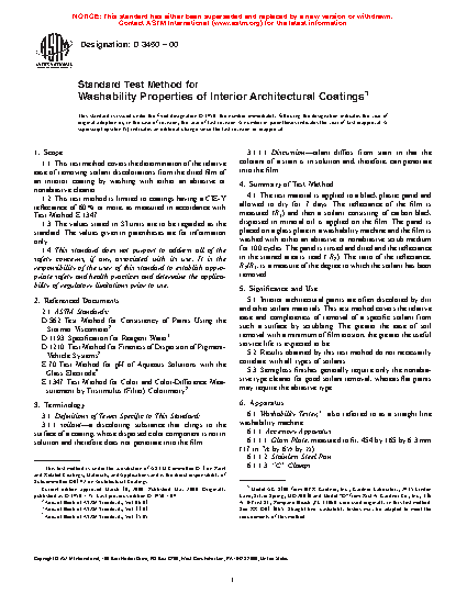 1.1 This test method covers the determination of the relative ease of removing soilant discolorations from the dried film of an interior coating by washing with either an abrasive or nonabrasive cleaner.