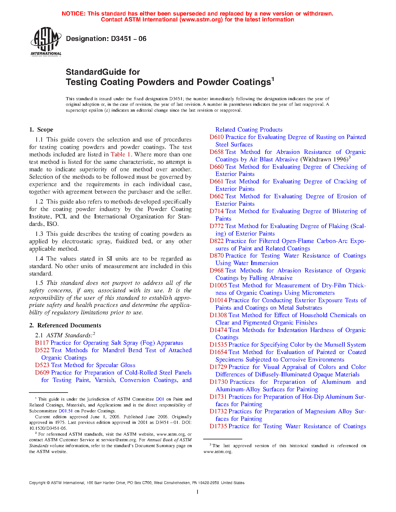 1.1 This guide covers the selection and use of procedures for testing coating powders and powder coatings. The test methods included are listed in Table 1. Where more than one test method is listed for the same characteristic, no attempt is made to indicate superiority of one method over another. Selection of the methods to be followed must be governed by experience and the requirements in each individual case, together with agreement between the purchaser and the seller.