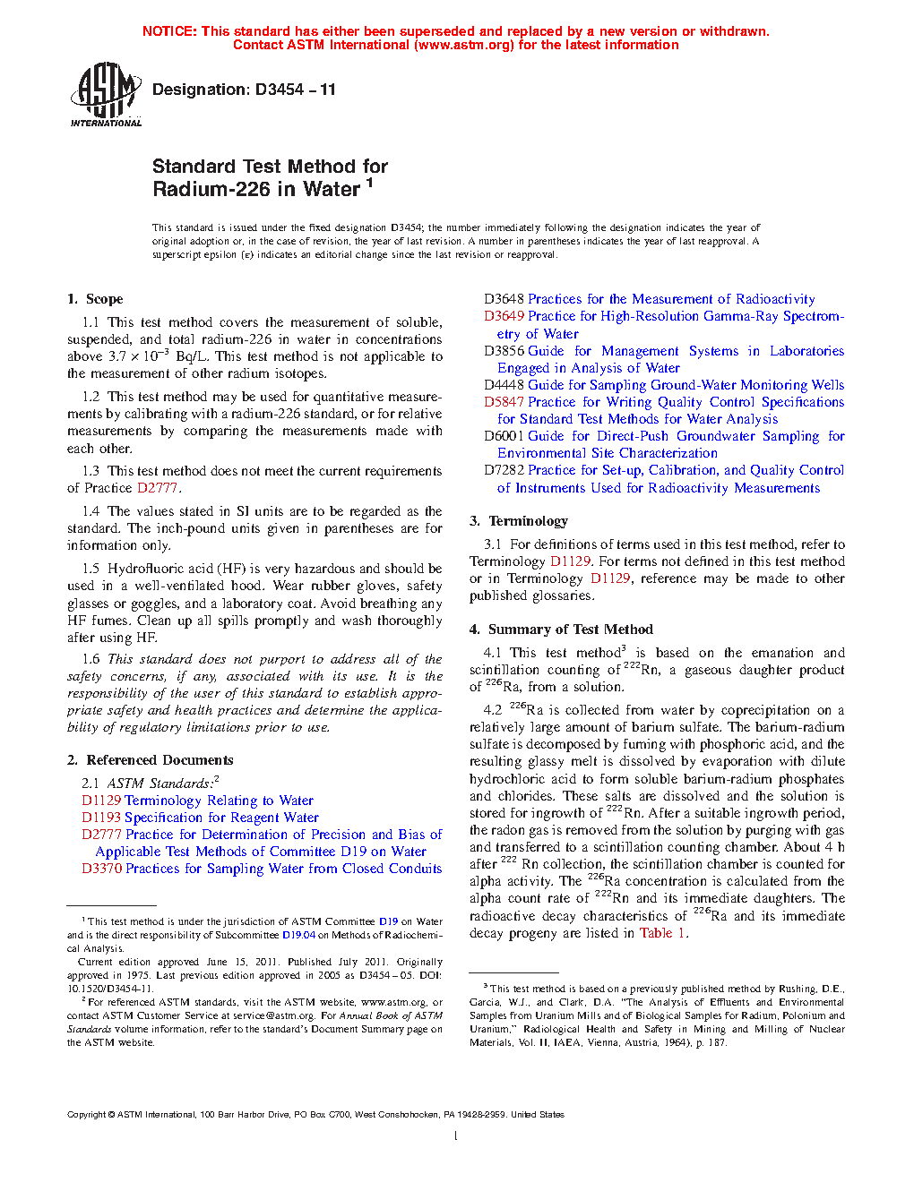 1.6 This standard does not purport to address all of the other safety concerns, if any, associated with its use. It is the responsibility of the user of this standard to establish appropriate safety and health practices and determine the applicability of regulatory limitations prior to use. The most prevalent of the five radium isotopes in ground water, having a half life greater than one day, are 226Ra and 228Ra. These two isotopes also present the greatest health risk compared to the other naturally occurring nuclides of equal concentrations if ingested via the water pathway. Although primarily utilized on a water medium, this technique may be applicable for the measurement of the 226Ra content of any media once the medium has been completely decomposed and put into an aqueous solution. The general methodology and basis of this technique are similar to the methodology “226Ra in Drinking Water (Radon Emanation Technique)” as described in the document EPA-600//4-80-032.