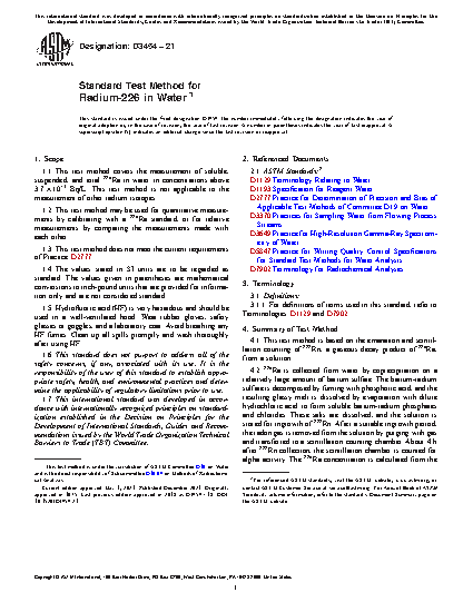 1.1 This test method covers the measurement of soluble, suspended, and total radium-226 in water in concentrations above 3.7 × 10−3 Bq/L. This test method is not applicable to the measurement of other radium isotopes.