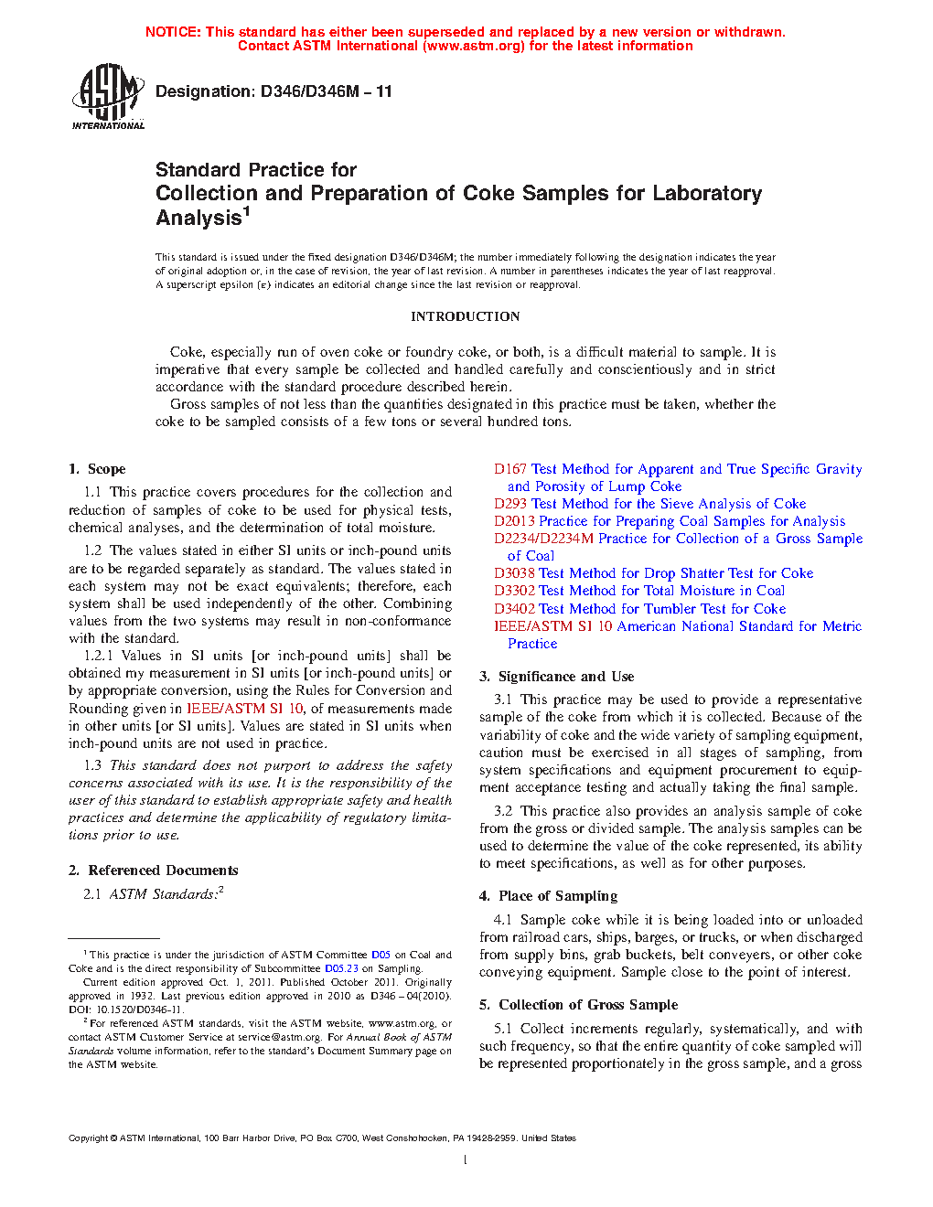 1.1 This practice covers procedures for the collection and reduction of samples of coke to be used for physical tests, chemical analyses, and the determination of total moisture.
