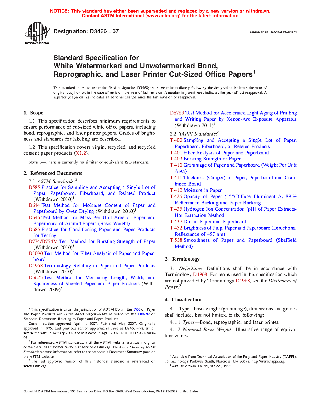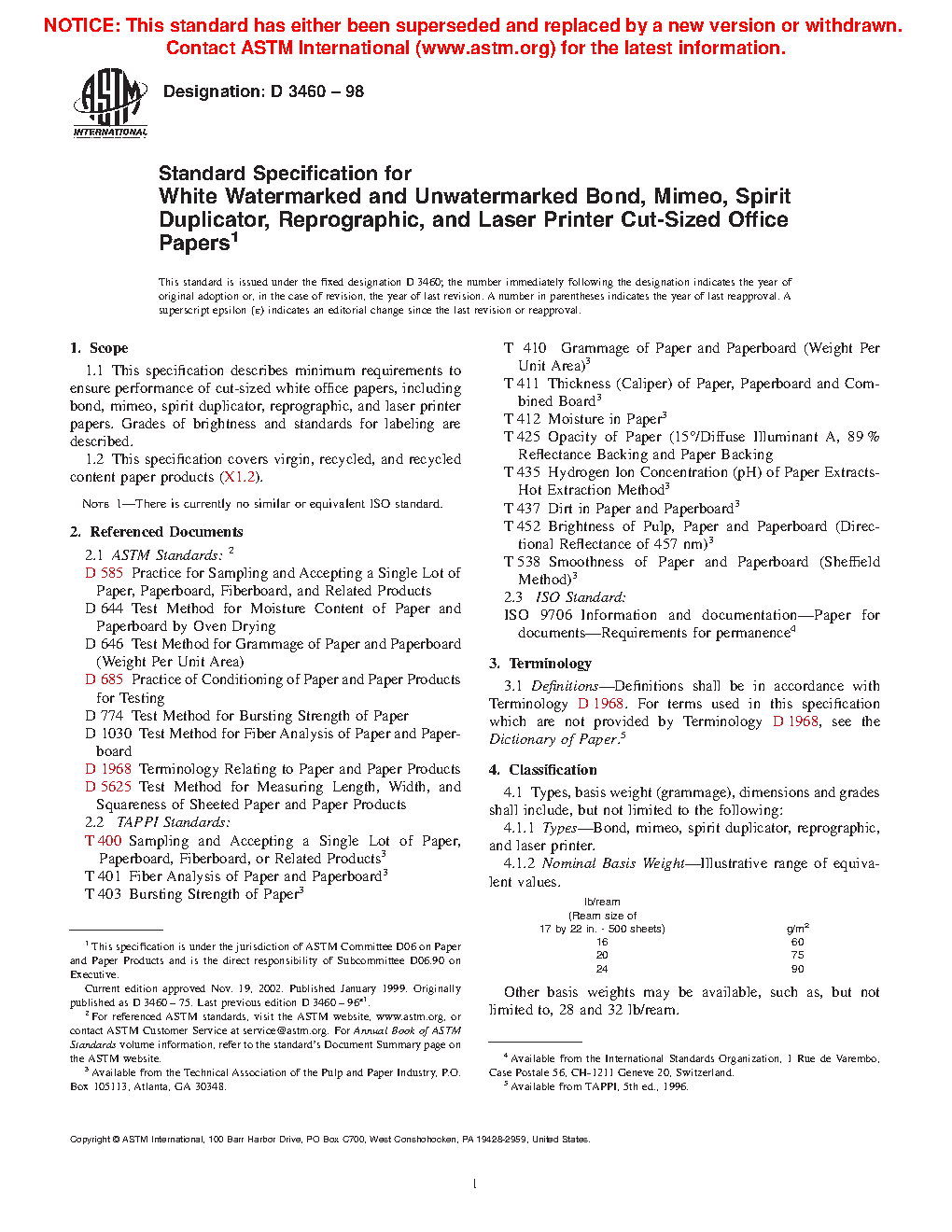 Standard Specification for White Watermarked and Unwatermarked Bond, Mimeo, Spirit Duplicator, Reprographic, and Laser Printer Cut-Sized Office Papers (Withdrawn 2007)