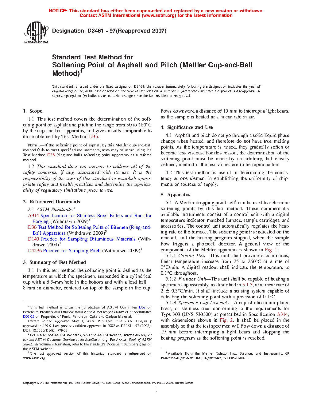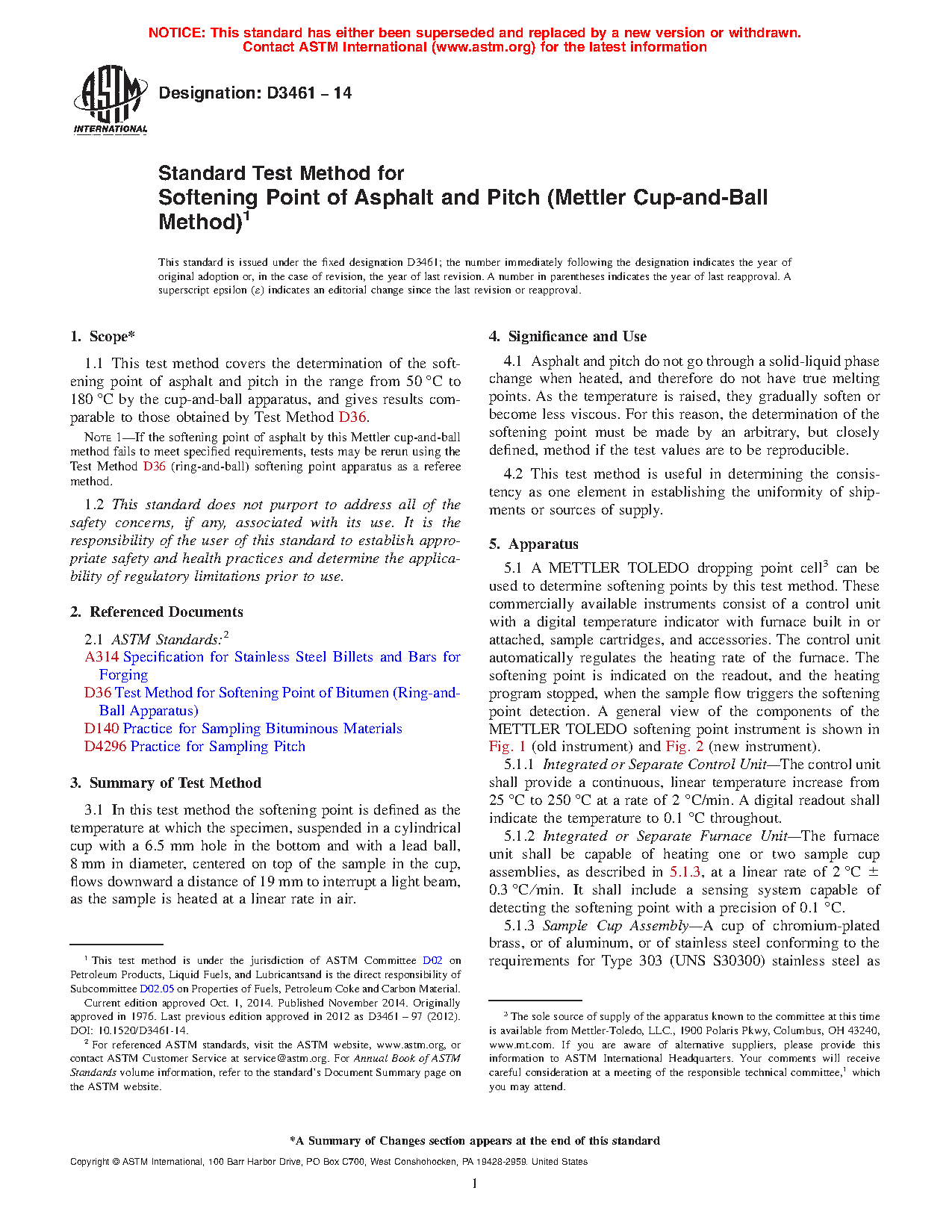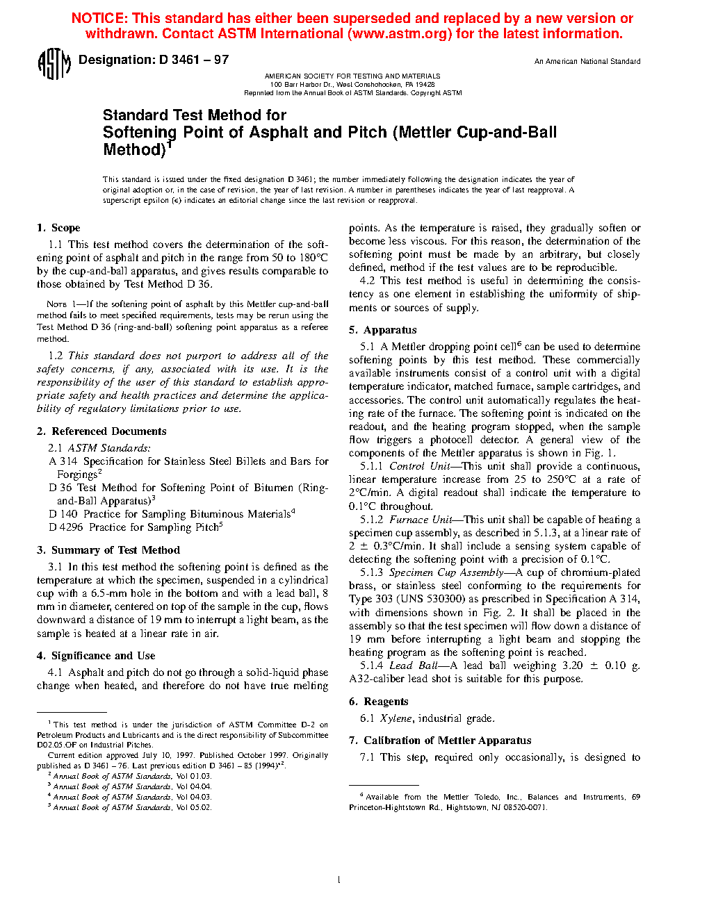 Note 1: If the softening point of asphalt by this Mettler cup-and-ball method fails to meet specified requirements, tests may be rerun using the Test Method D36 (ring-and-ball) softening point apparatus as a referee method.