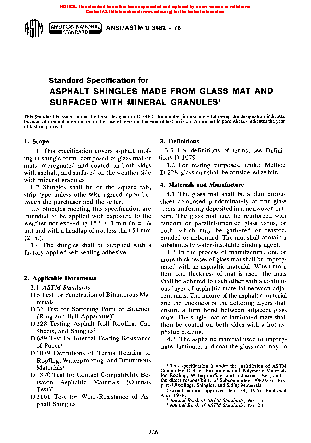 1.1 This specification covers asphalt roofing in shingle form, composed of glass felt or felts impregnated and coated on both sides with asphalt, and surfaced on the weather side with mineral granules. This specification is designed for the evaluation of products as manufactured. The test methods, physical requirements, and minimum masses are to be measured immediately after packaging or at a reasonable time, as agreed upon between buyer and seller, after manufacture and before installation. Physical and performance requirements after application and during in-service use of the products described herein are beyond the scope of this material specification.