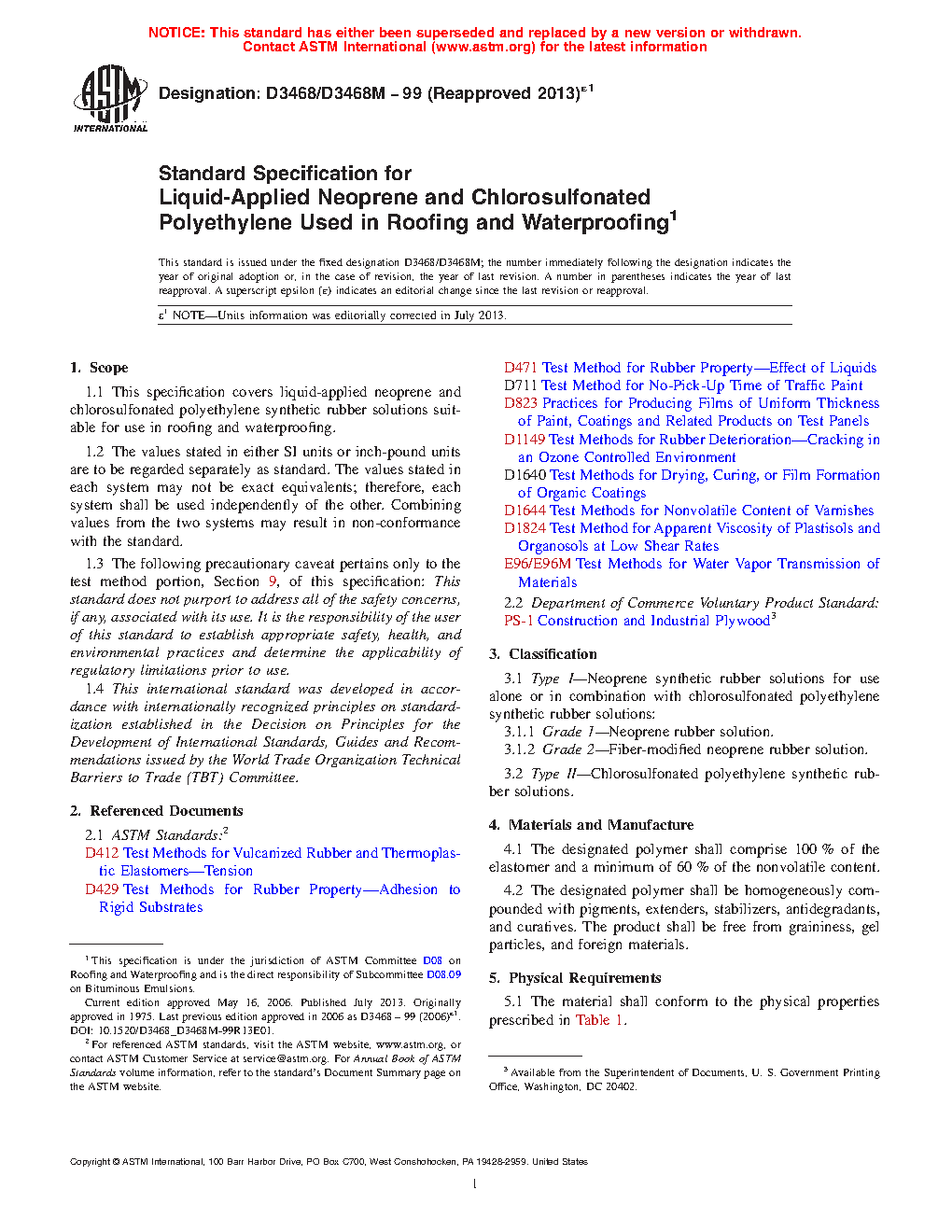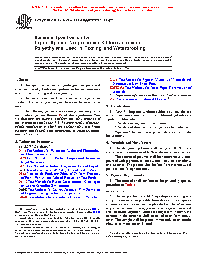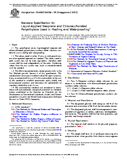 1.1 This specification covers liquid-applied neoprene and chlorosulfonated polyethylene synthetic rubber solutions suitable for use in roofing and waterproofing.