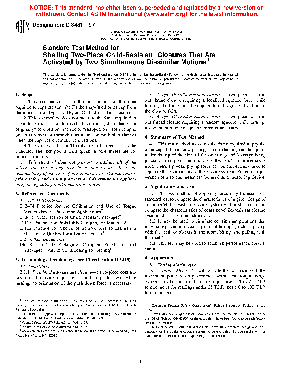 1.2 This test method does not measure the force required to separate parts of a child-resistant closure system that were originally "screwed-on" instead of "snapped-on" (for example, pull a cap over or through continuous or multi-start threads when the cap was originally screwed on).