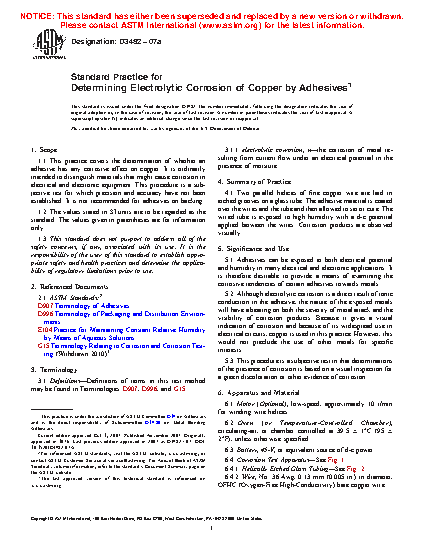 1.1 This practice covers the determination of whether an adhesive has any corrosive effect on copper. It is ordinarily intended to distinguish materials that might cause corrosion in electrical and electronic equipment. This procedure is a subjective test for which precision and accuracy have not been established. It is not recommended for adhesives on backing.