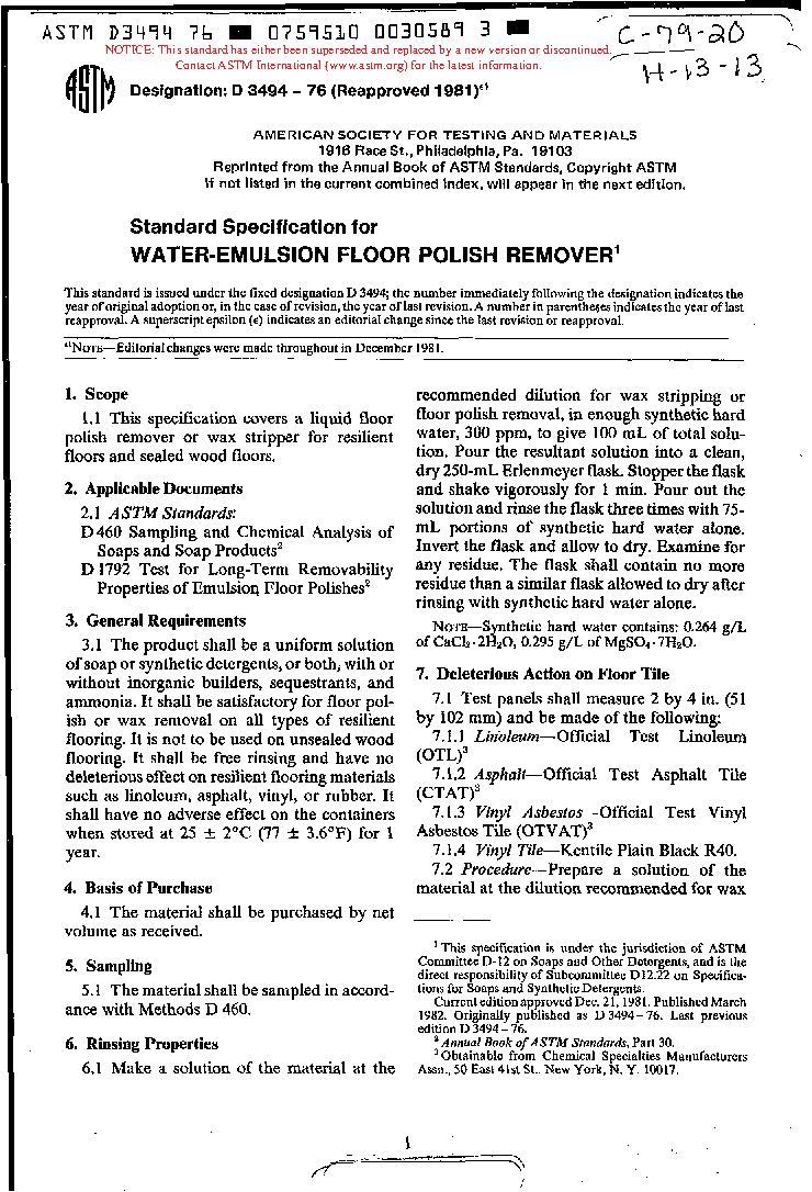 Standard Specification for Water-Emulsion Floor Polish Remover