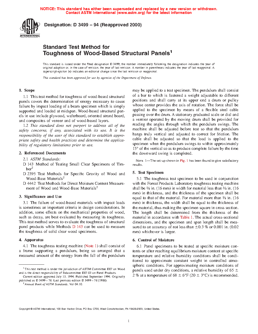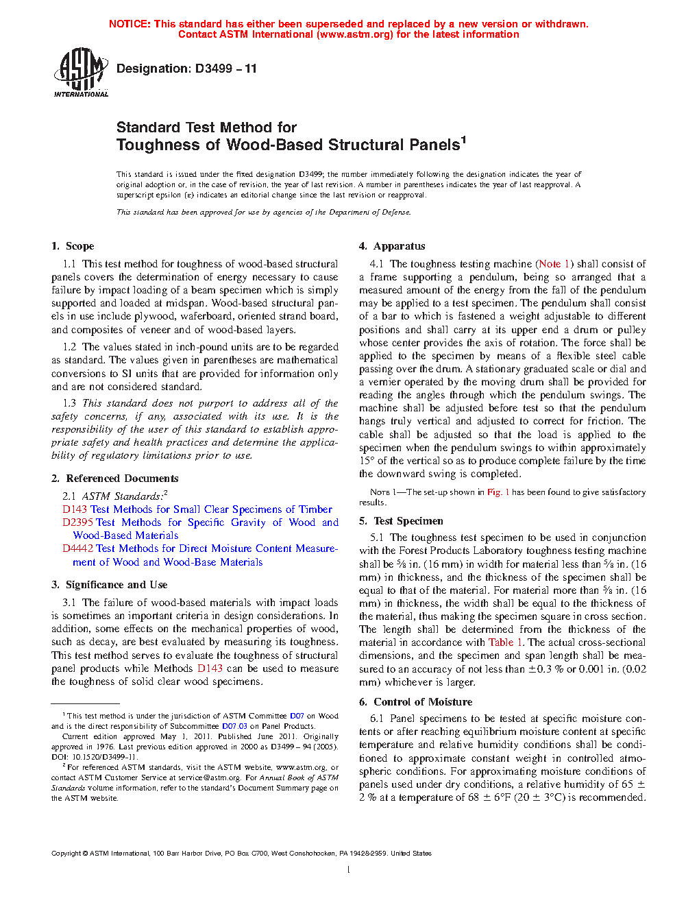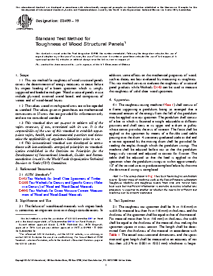 3.1 The failure of wood-based materials with impact loads is sometimes an important criteria in design considerations. In addition, some effects on the mechanical properties of wood, such as decay, are best evaluated by measuring its toughness. This test method serves to evaluate the toughness of structural panel products while Methods D143 can be used to measure the toughness of solid clear wood specimens.