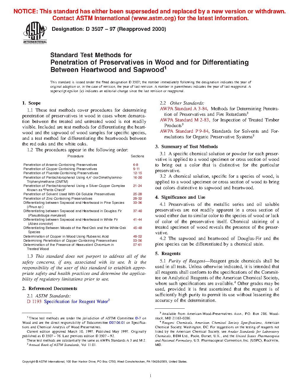 Procedure Sections Penetration of Arsenic-Containing Preservatives 6 to 8 Penetration of Copper-Containing Preservatives 9 to 11 Penetration of Fluoride-Containing Preservatives 12 to 15 Penetration of Pentachlorophenol Using 4,4[prime]-bis-Dimethylamino-Triphenylmethane (DMTM) 16 to 20 Penetration of Pentachlorophenol Using a Silver-Copper Complex Known as "Penta-Check" 21 to 24 Penetration of Solvent Used With Oil-Soluble Preservatives 25 to 28 Penetration of Zinc-Containing Preservatives 29 to 32 Differentiating between Sapwood and Heartwood in Pine Species (Pinus sp.) 33 to 36 Differentiating between Sapwood and Heartwood in Douglas Fir (Pseudotsuga menziesii) 37 to 40 Differentiating between Sapwood and Heartwood in White Fir (Abies concolor) 41 to 44 Differentiating Between Woods of the Red Oak and the White Oak Species 45 to 481.3 This standard does not purport to address all of the safety problems, if any, associated with its use. It is the responsibility of the user of this standard to establish appropriate safety and health practices and determine the applicability of regulatory limitations prior to use.