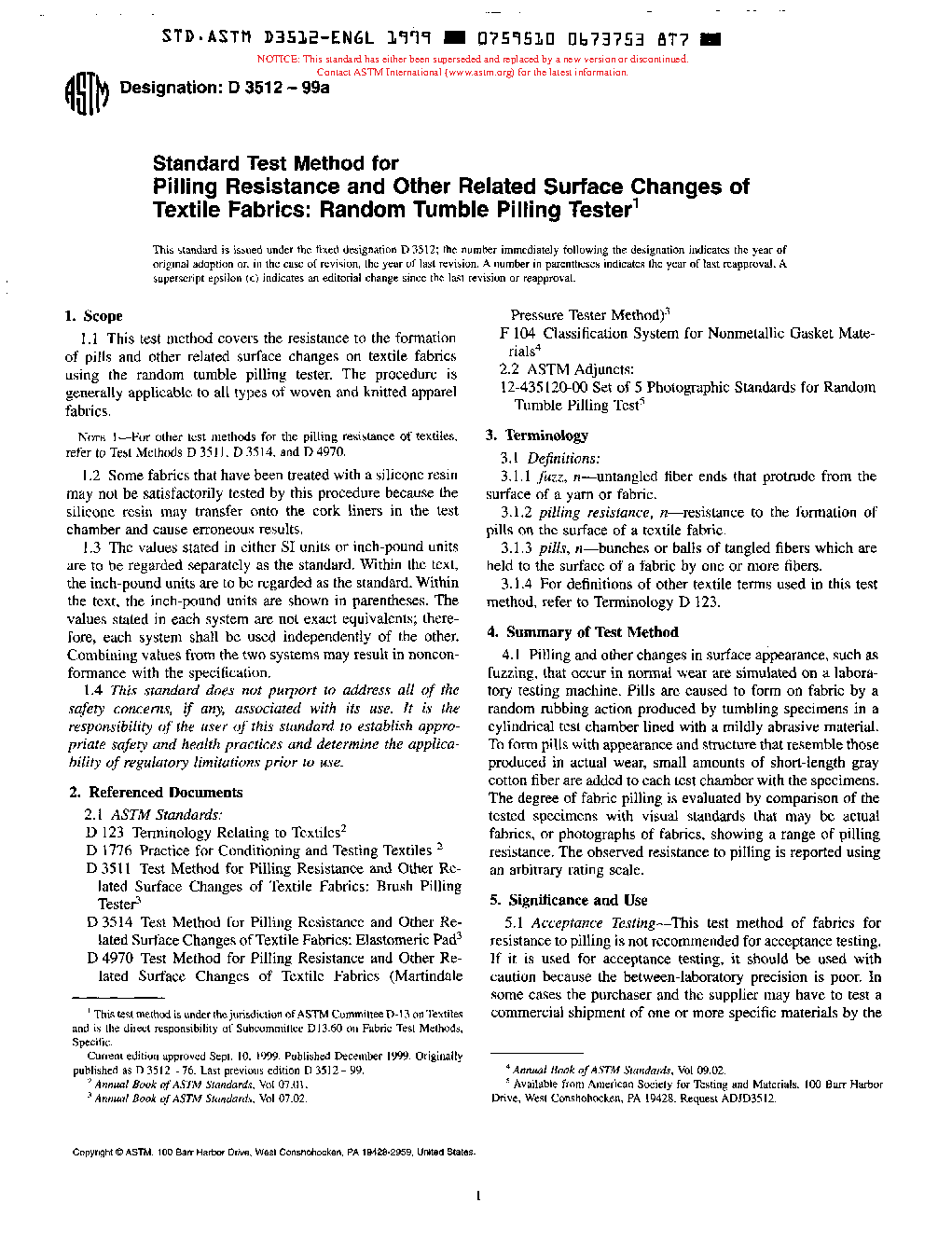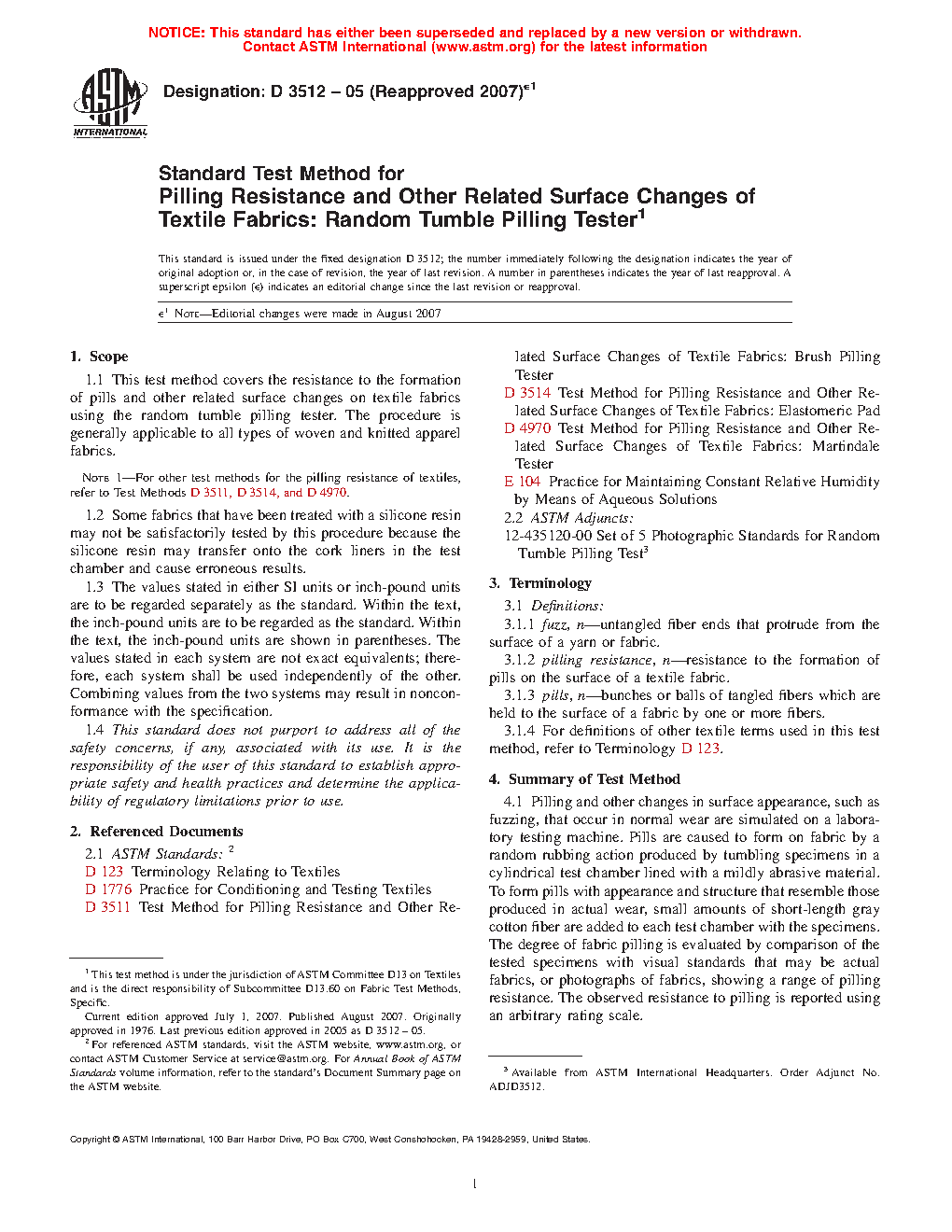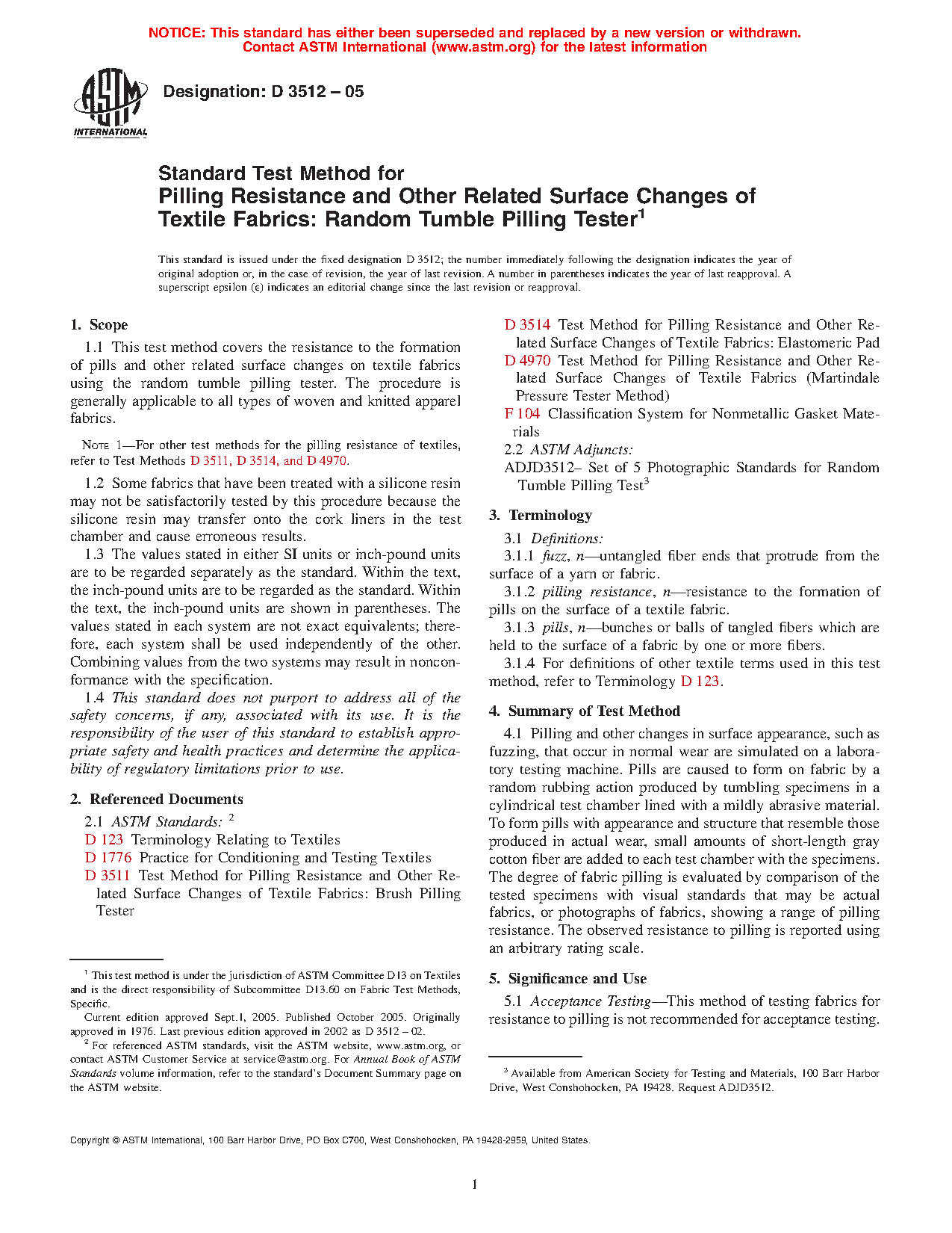 Note 1—For other test methods for the pilling resistance of textiles, refer to Test Methods D 3511, D 3514, and D 4970