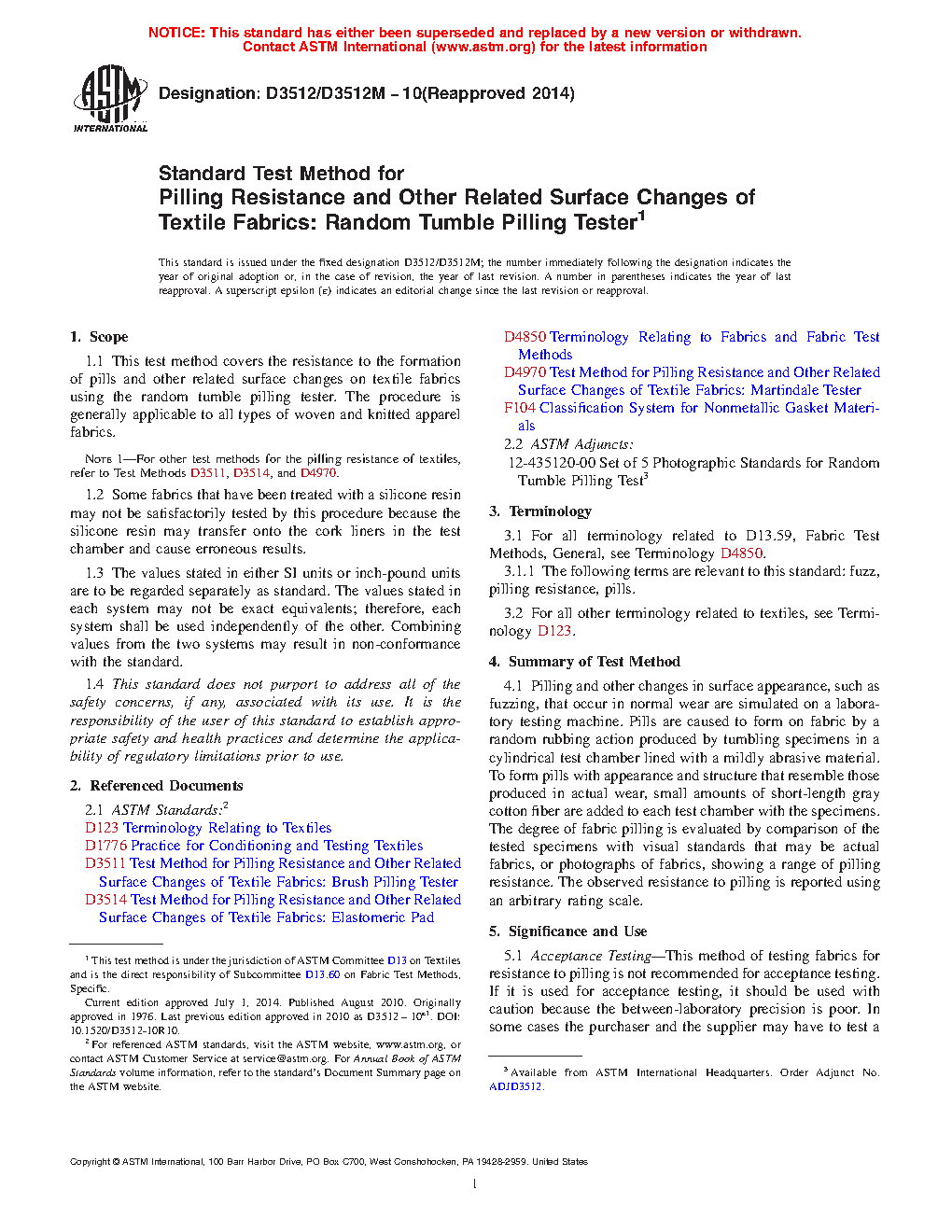 5.1 Acceptance Testing—This method of testing fabrics for resistance to pilling is not recommended for acceptance testing. If it is used for acceptance testing, it should be used with caution because the between-laboratory precision is poor. In some cases the purchaser and the supplier may have to test a commercial shipment of one or more specific materials by the best available test method, even though the test method is not recommended for acceptance testing.