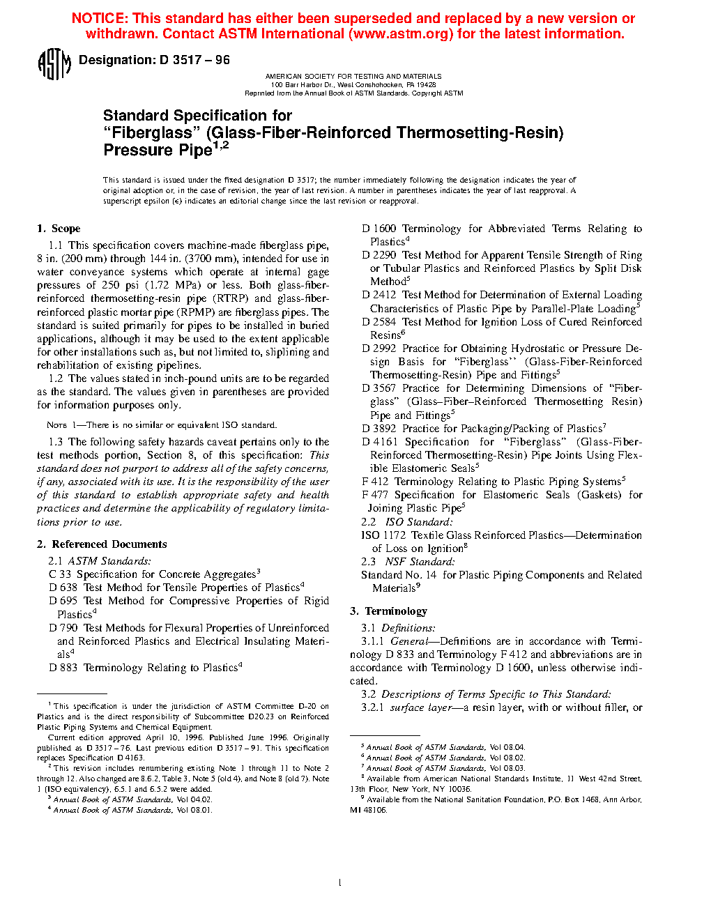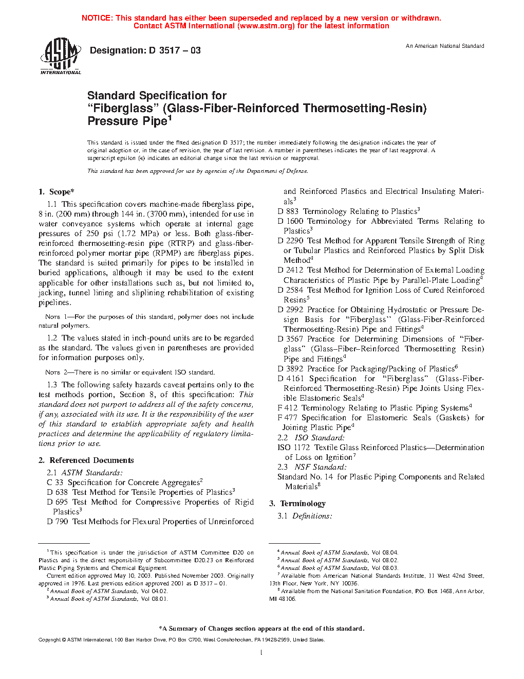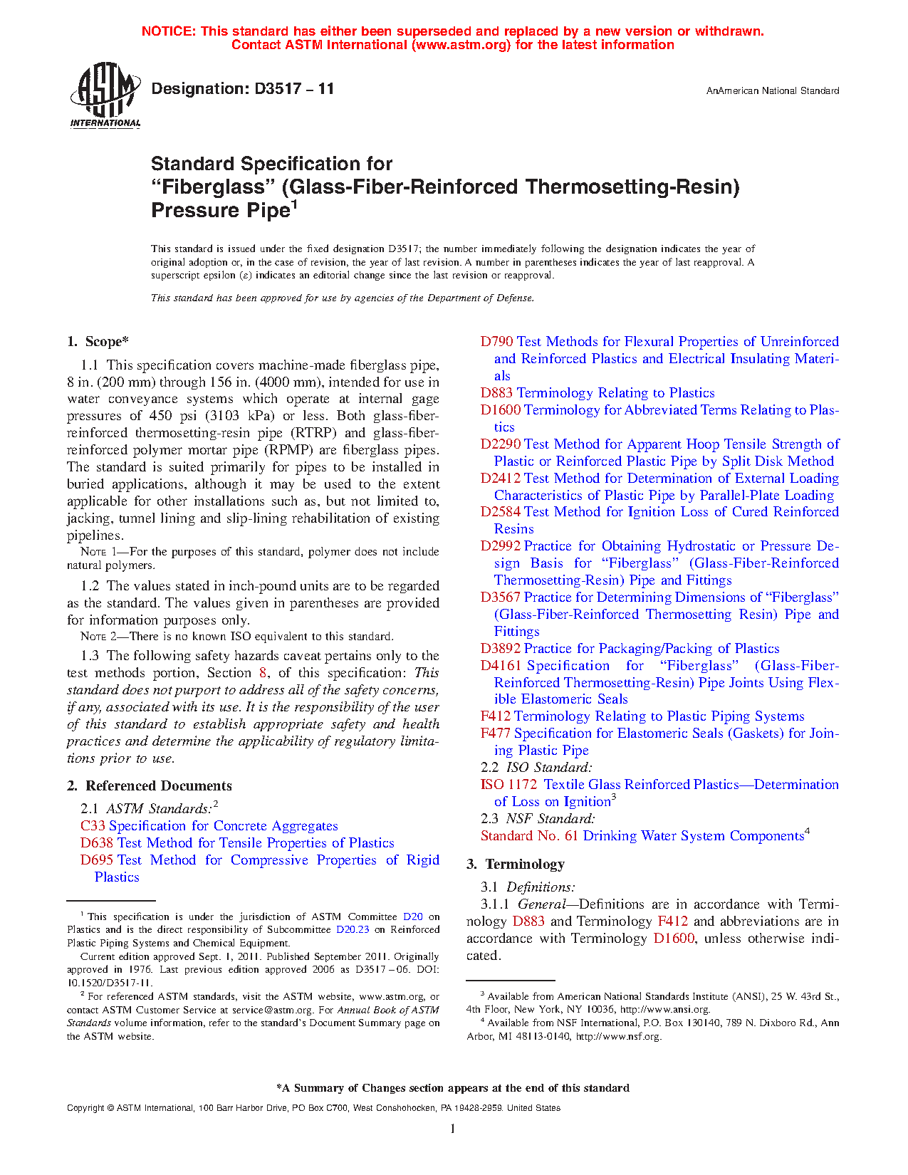 1.1 This specification covers machine-made fiberglass pipe, 8 in. (200 mm) through 156 in. (4000 mm), intended for use in water conveyance systems which operate at internal gage pressures of 450 psi (3103 kPa) or less. Both glass-fiber-reinforced thermosetting-resin pipe (RTRP) and glass-fiber-reinforced polymer mortar pipe (RPMP) are fiberglass pipes. The standard is suited primarily for pipes to be installed in buried applications, although it may be used to the extent applicable for other installations such as, but not limited to, jacking, tunnel lining and slip-lining rehabilitation of existing pipelines.