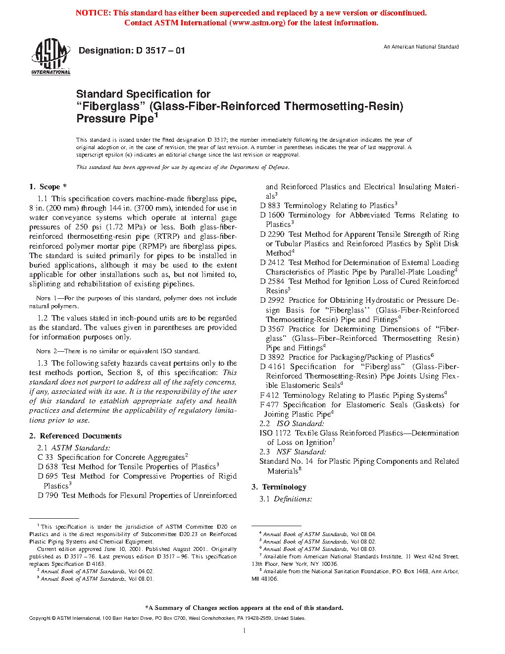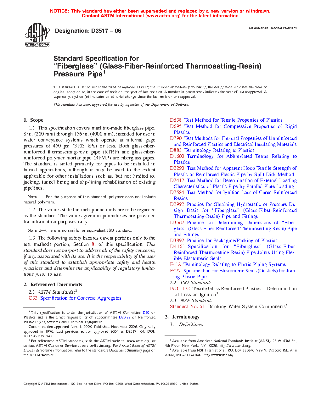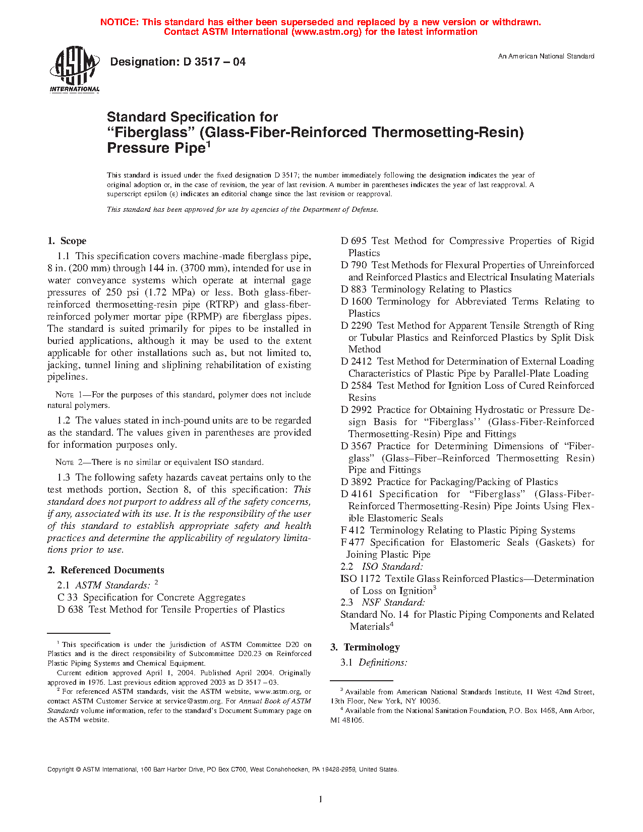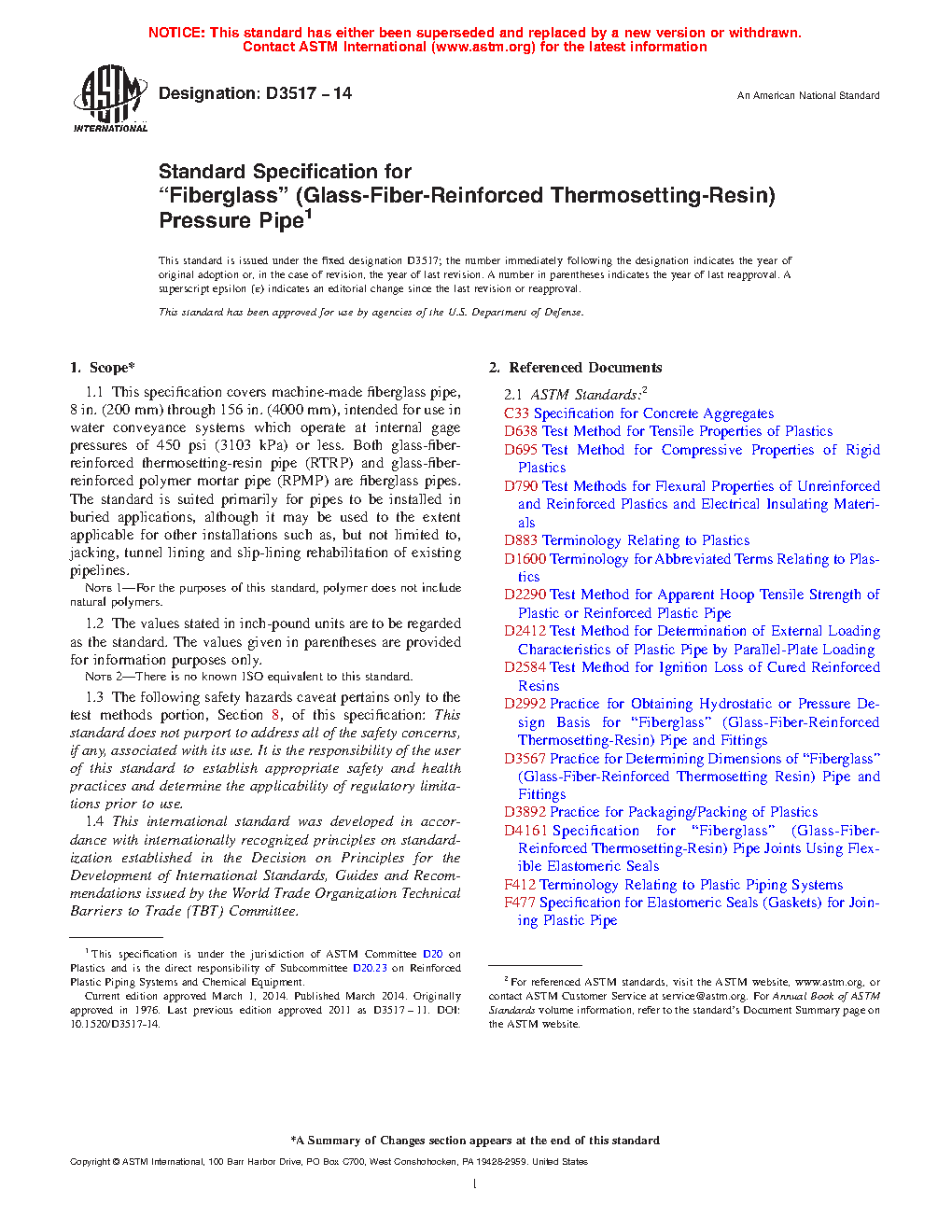 1.1 This specification covers machine-made fiberglass pipe, 8 in. (200 mm) through 156 in. (4000 mm), intended for use in water conveyance systems which operate at internal gage pressures of 450 psi (3103 kPa) or less. Both glass-fiber-reinforced thermosetting-resin pipe (RTRP) and glass-fiber-reinforced polymer mortar pipe (RPMP) are fiberglass pipes. The standard is suited primarily for pipes to be installed in buried applications, although it may be used to the extent applicable for other installations such as, but not limited to, jacking, tunnel lining and slip-lining rehabilitation of existing pipelines.