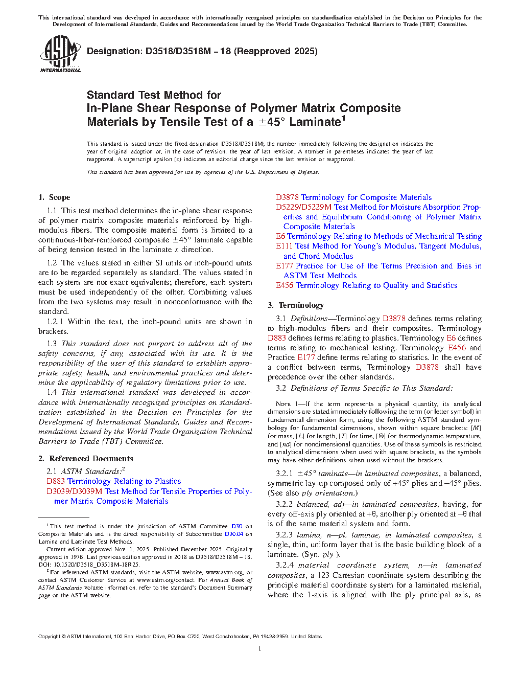 1.1 This test method determines the in-plane shear response of polymer matrix composite materials reinforced by high-modulus fibers. The composite material form is limited to a continuous-fiber-reinforced composite ±45° laminate capable of being tension tested in the laminate x direction.