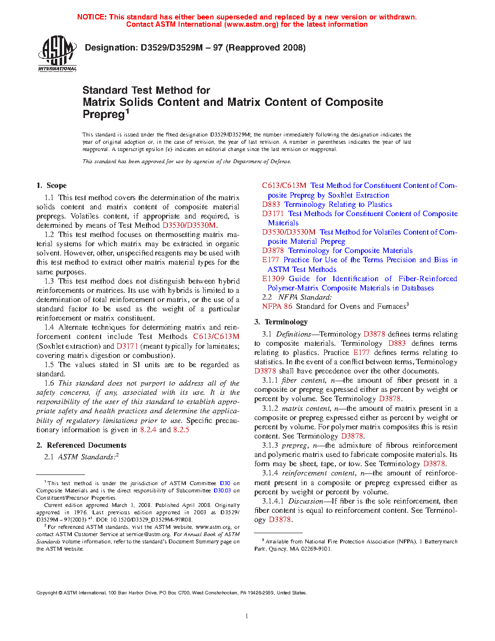 1.1 This test method covers the determination of the fiber content, fiber areal weight, matrix solids content and matrix content of composite material prepregs. Optionally, the matrix solids content can also be determined after a volatiles content has been established. Volatiles content, if appropriate and required, is determined by means of Test Method D3530/D3530M.