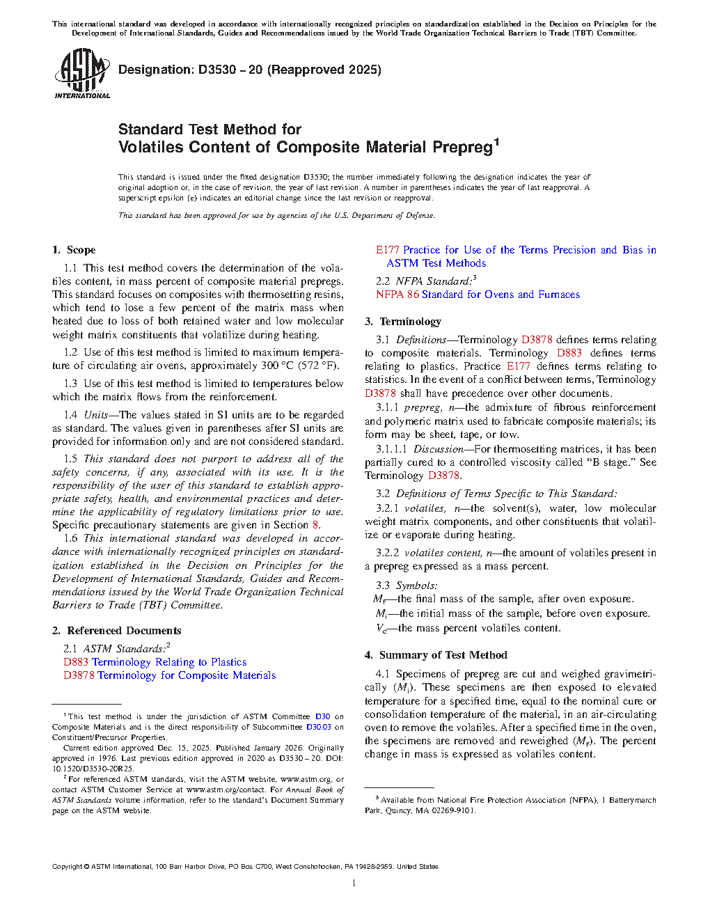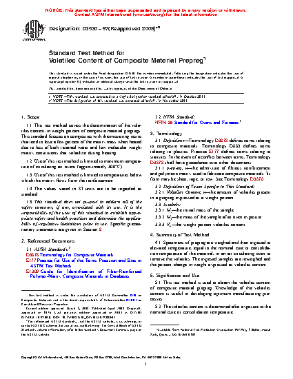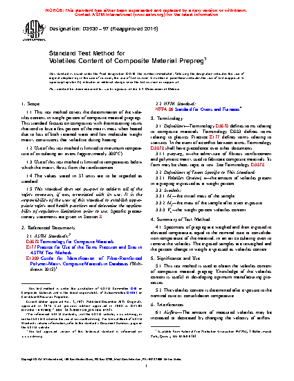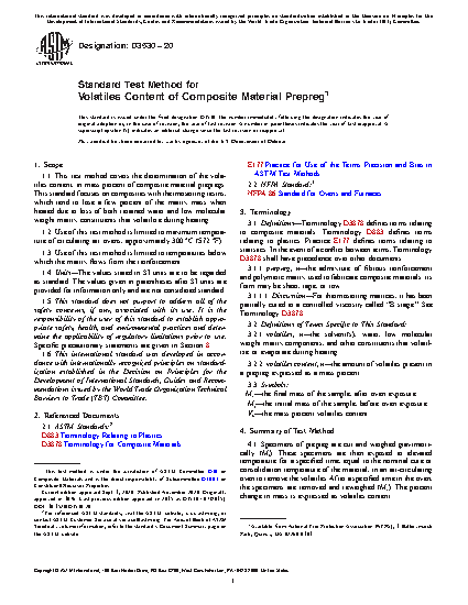 1.1 This test method covers the determination of the volatiles content, in weight percent of composite material prepregs. This standard focuses on composites with thermosetting resins that tend to lose a few percent of the matrix mass when heated due to loss of both retained water and low molecular weight matrix constituents that volatilize during heating.