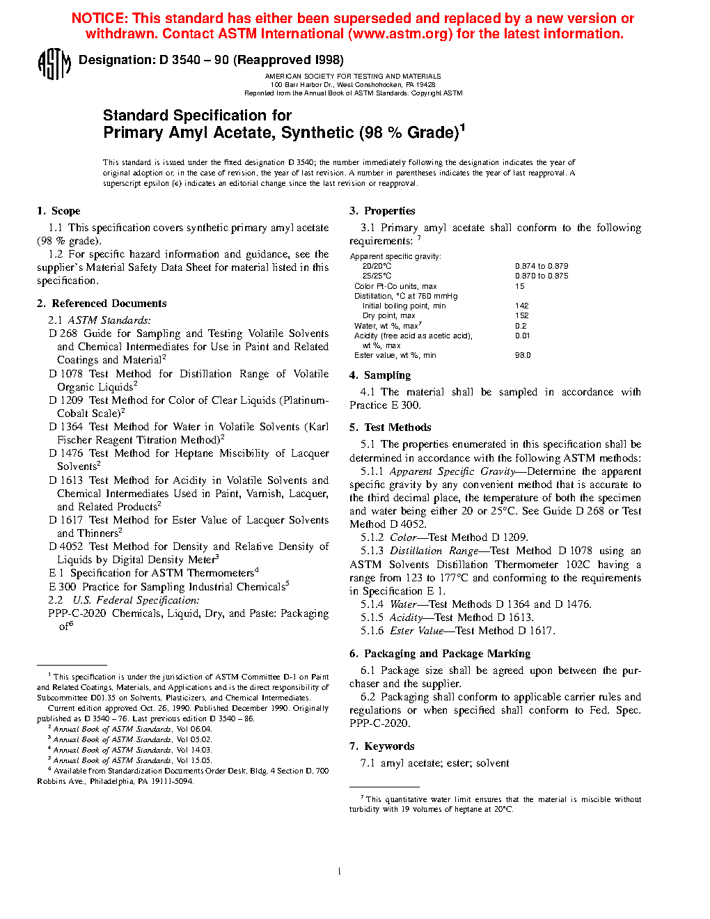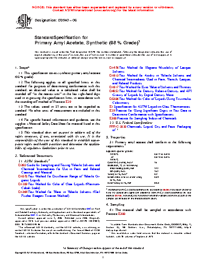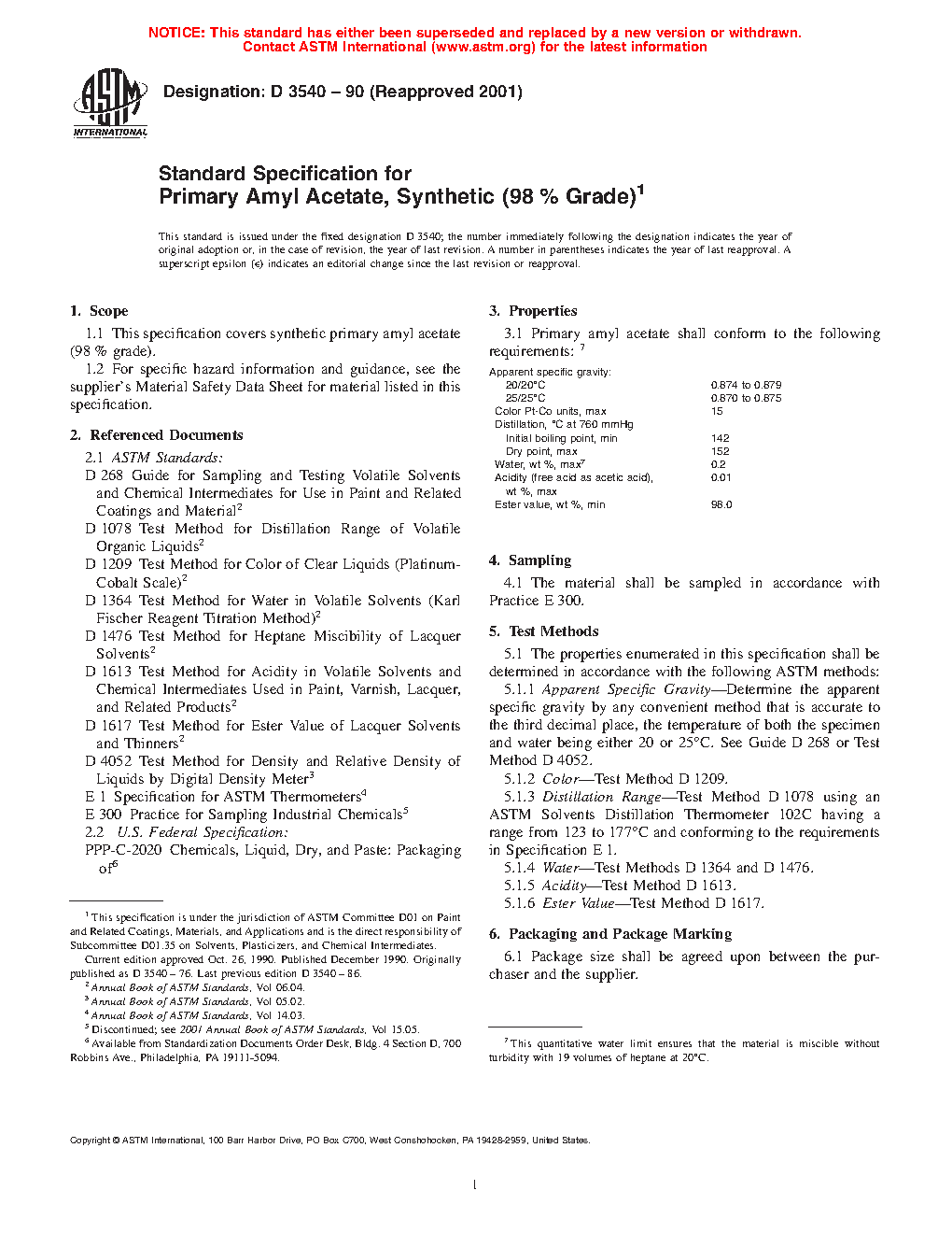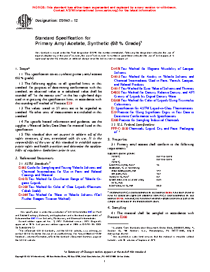 This specification covers synthetic primary amyl acetate (98 % grade). The apparent specific gravity, color property, distillation range, water property, acidity, and ester value shall be tested to meet the requirements prescribed.
