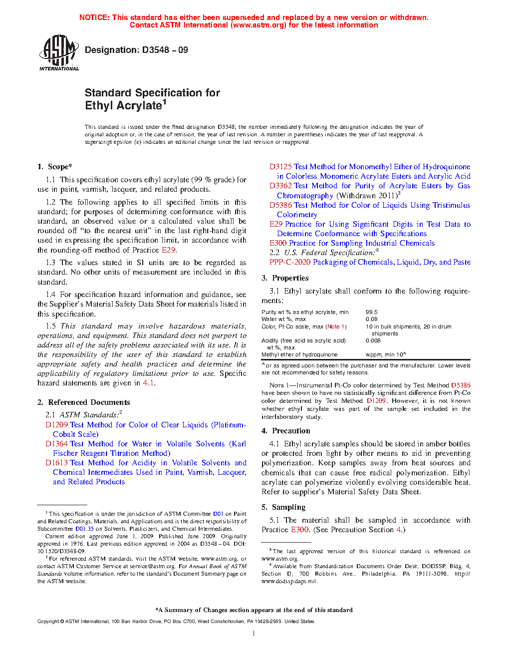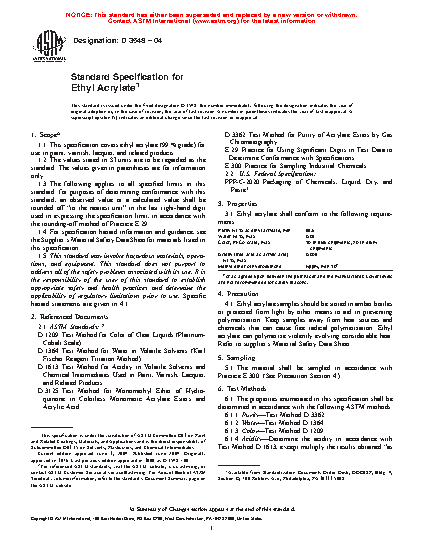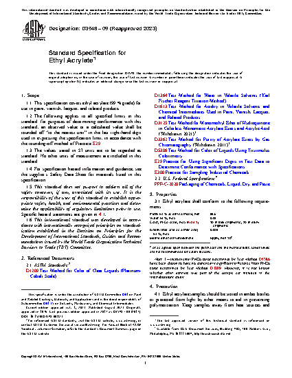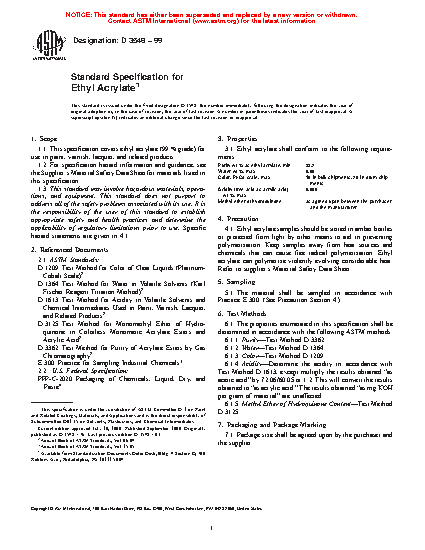 This specification establishes the properties and requirements for ethyl acrylate for use in paint, varnish, lacquer, and related products. Specimens shall be sampled, undergo chemical tests, and conform accordingly to purity, water content, color, acidity, and methyl ether of hydroquinone content requirements.