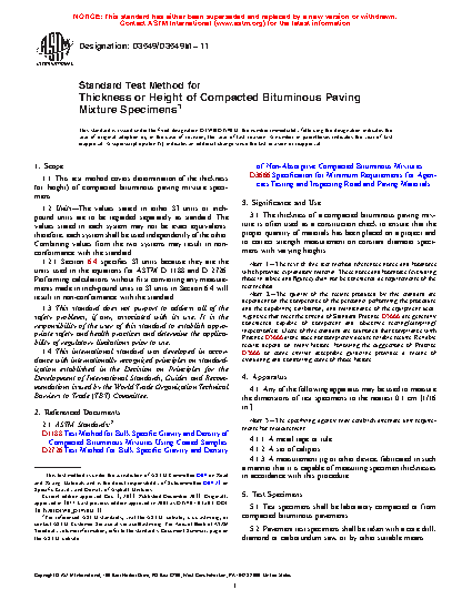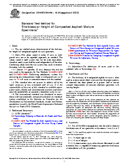 1.1 This test method covers determination of the thickness (or height) of compacted asphalt mixture specimens.