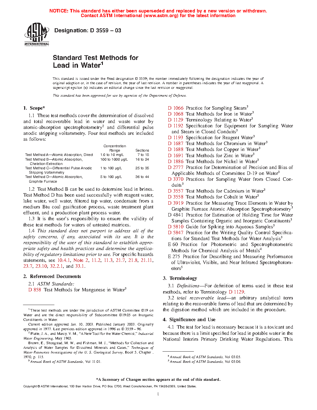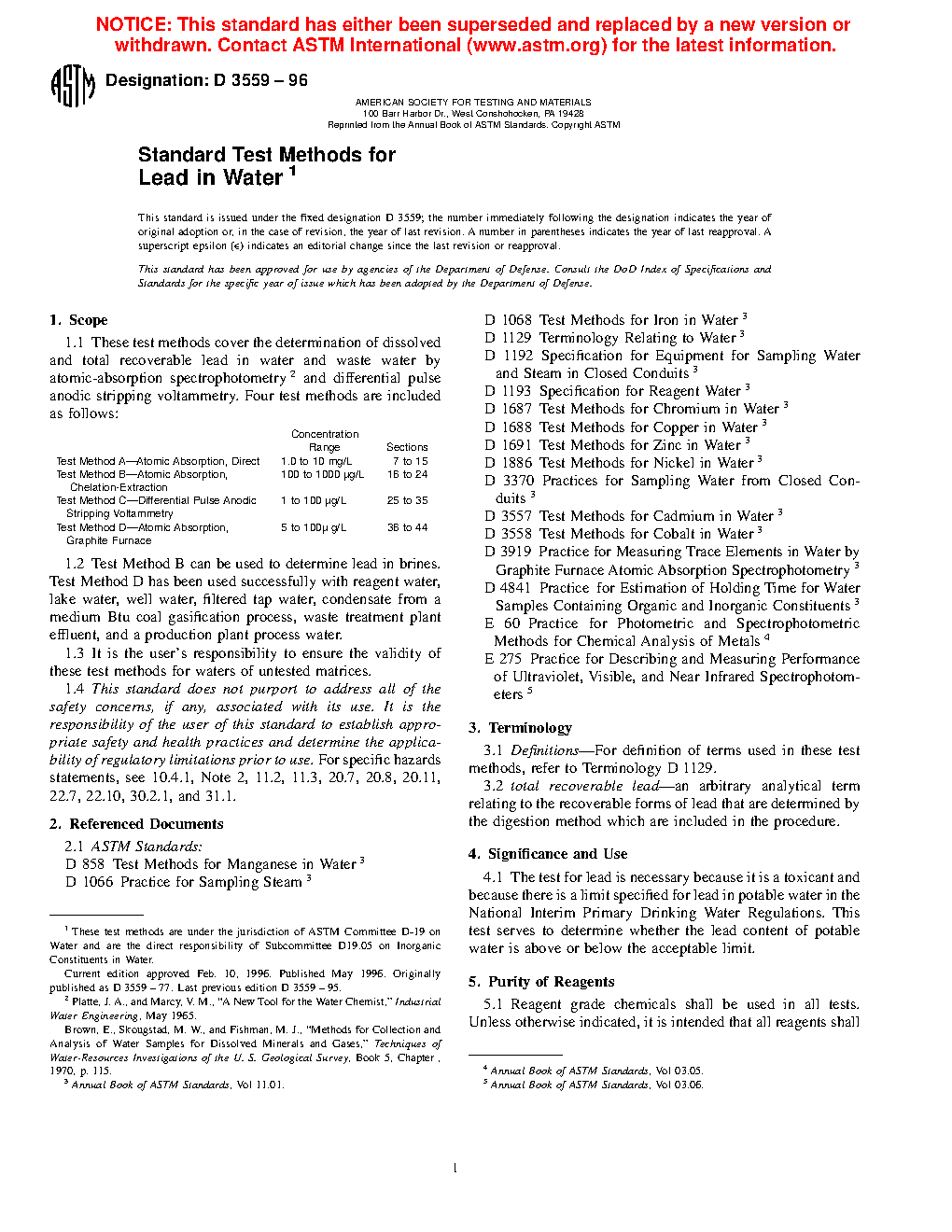 1.1 These test methods cover the determination of dissolved and total recoverable lead in water and waste water by atomic-absorption spectrophotometry2 and differential pulse anodic stripping voltammetry. Four test methods are included as follows: