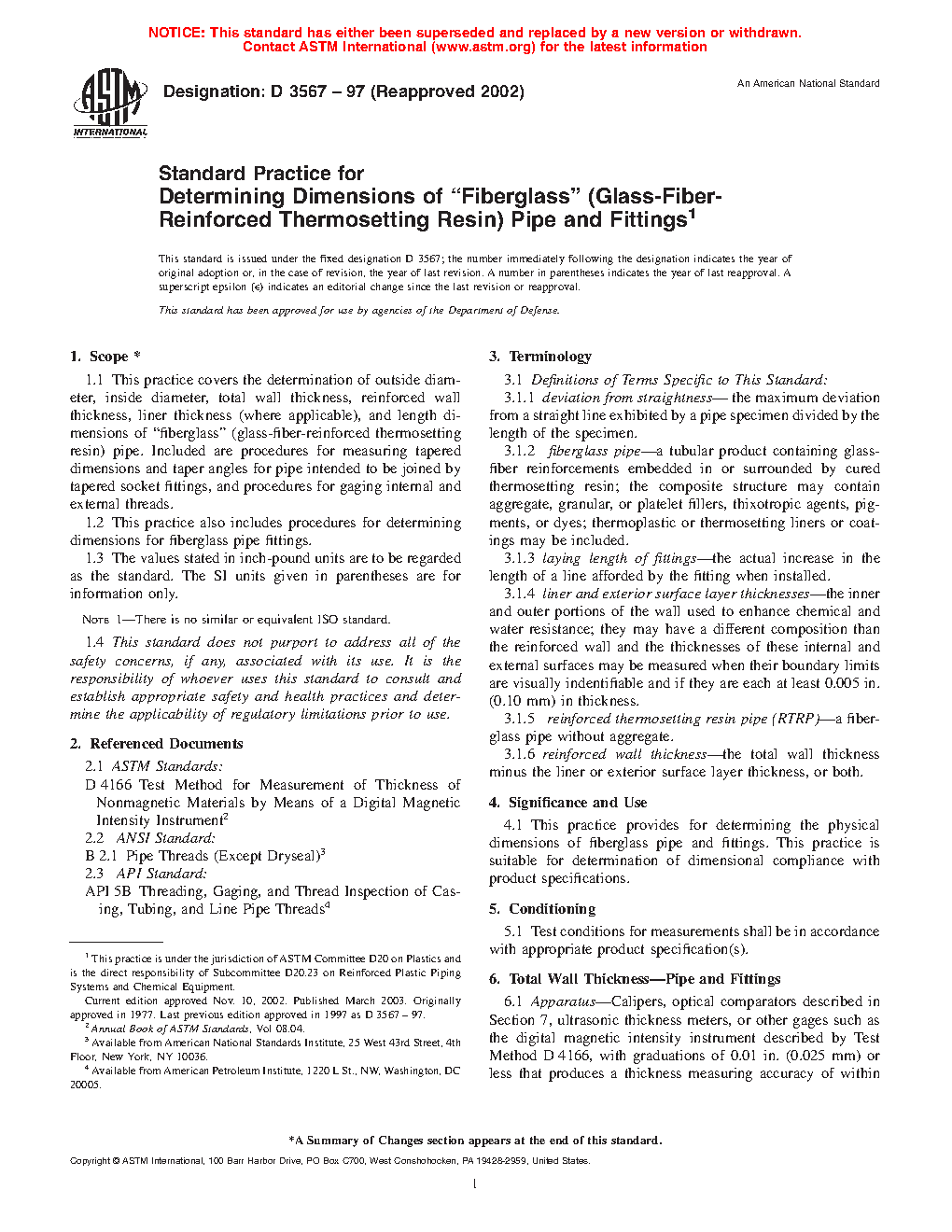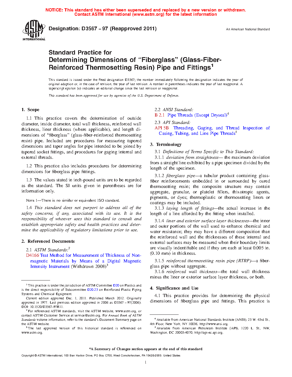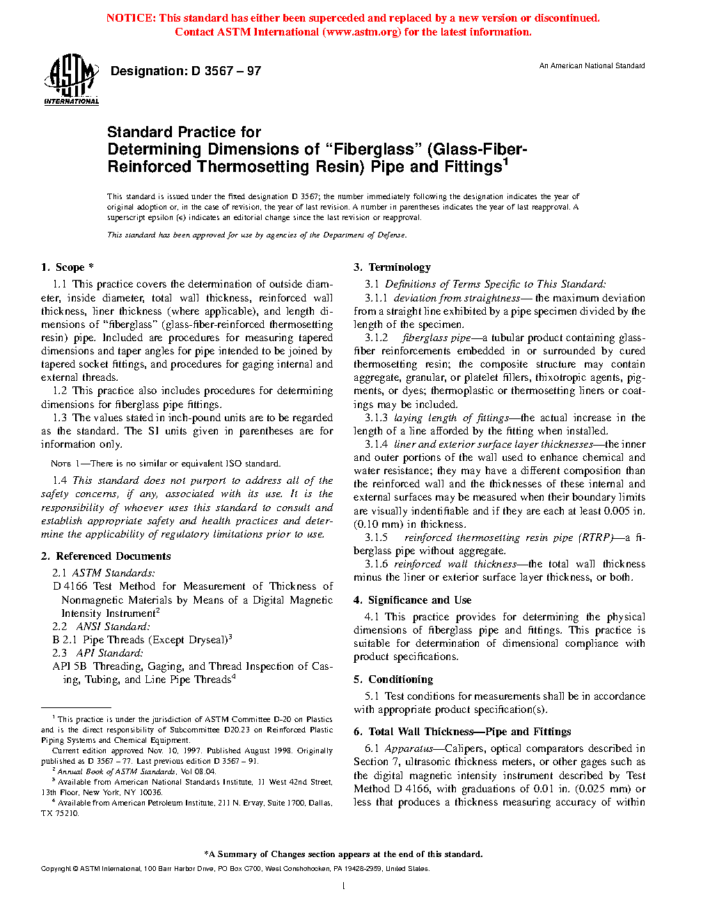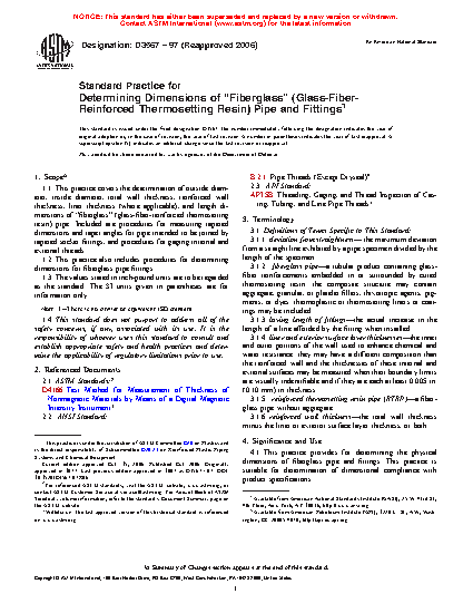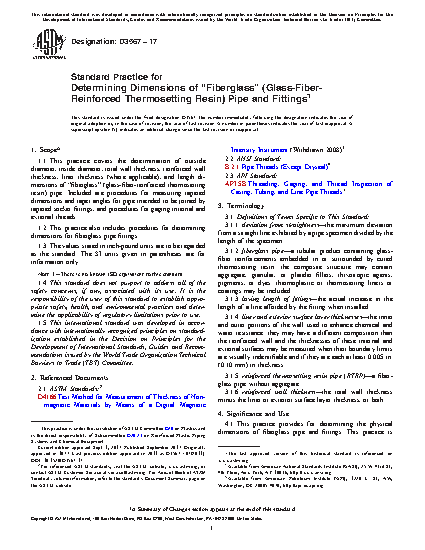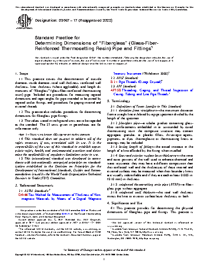 1.1 This practice covers the determination of outside diameter, inside diameter, total wall thickness, reinforced wall thickness, liner thickness (where applicable), and length dimensions of “fiberglass” (glass-fiber-reinforced thermosetting resin) pipe. Included are procedures for measuring tapered dimensions and taper angles for pipe intended to be joined by tapered socket fittings, and procedures for gaging internal and external threads.