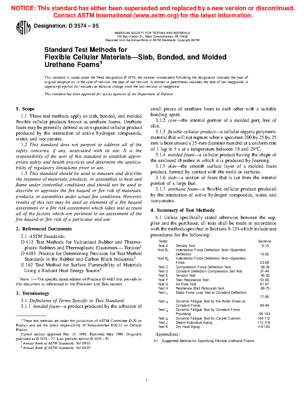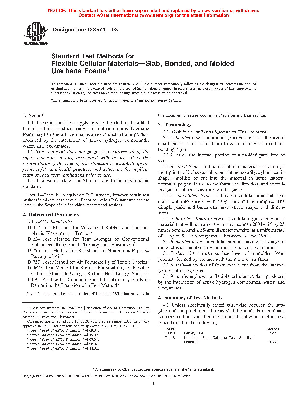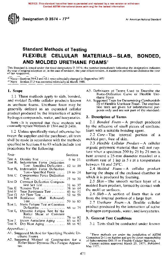 1.1 These test methods apply to slab, bonded, and molded flexible cellular products known as urethane foams. Urethane foam is generally defined as an expanded cellular product produced by the interaction of active hydrogen compounds, water, and isocyanates.