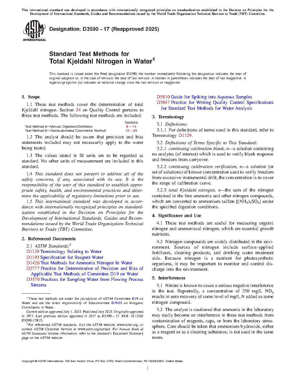 1.1 These test methods cover the determination of total Kjeldahl nitrogen. Section 24 on Quality Control pertains to these test methods. The following test methods are included: