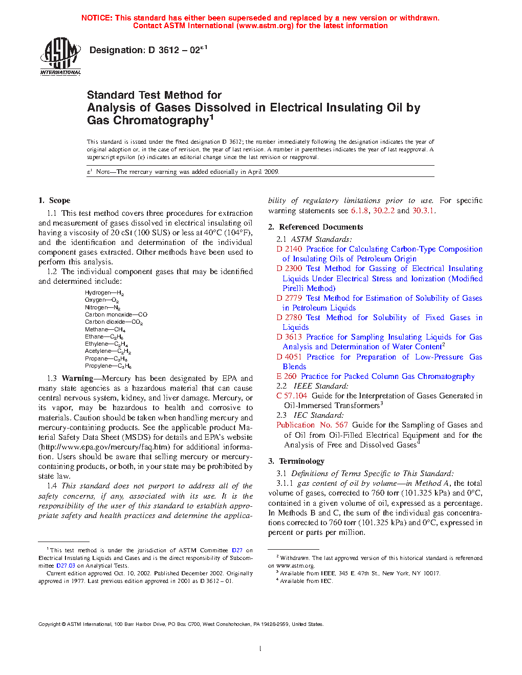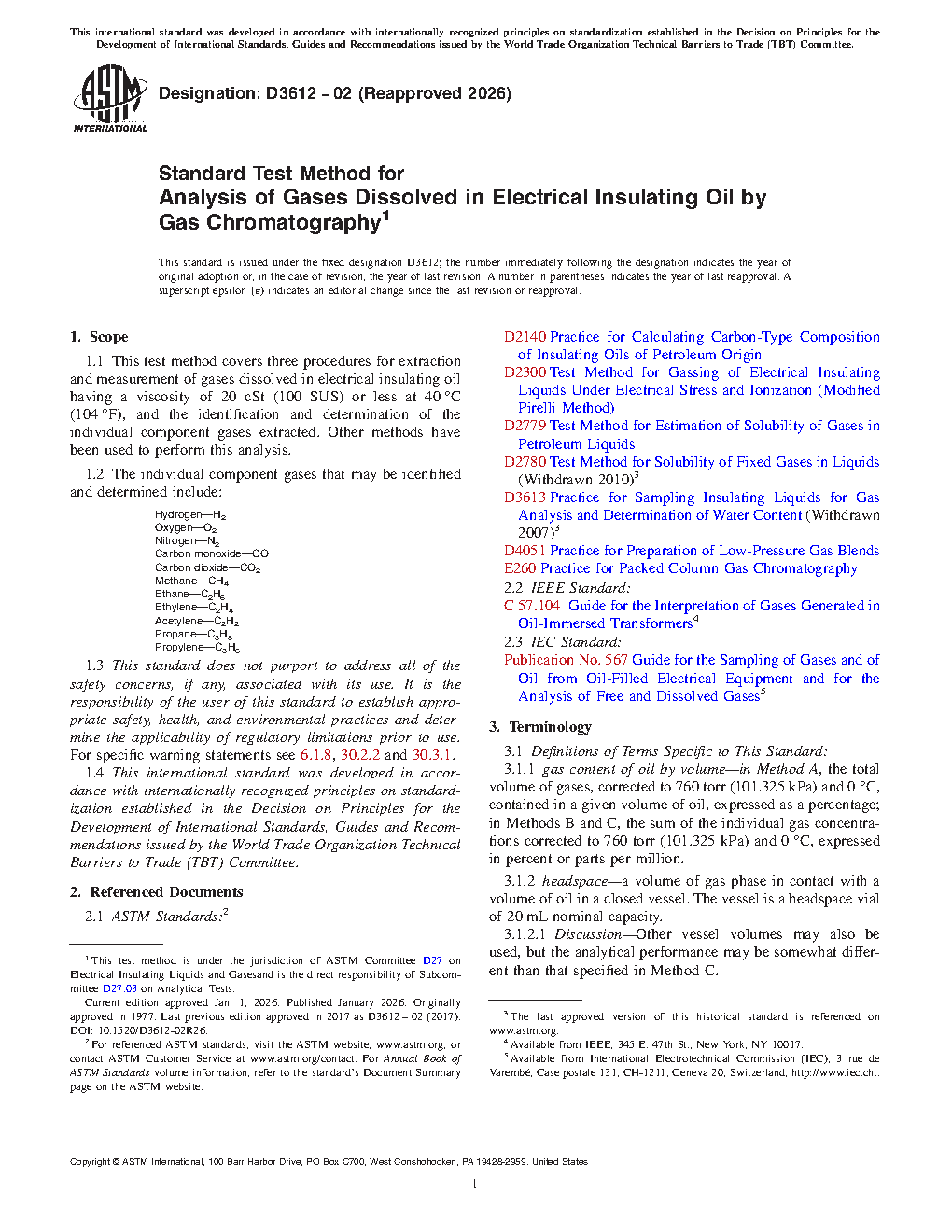 1.1 This test method covers three procedures for extraction and measurement of gases dissolved in electrical insulating oil having a viscosity of 20 cSt (100 SUS) or less at 40°C (104°F), and the identification and determination of the individual component gases extracted. Other methods have been used to perform this analysis.