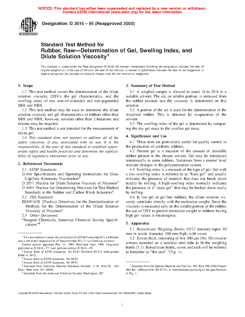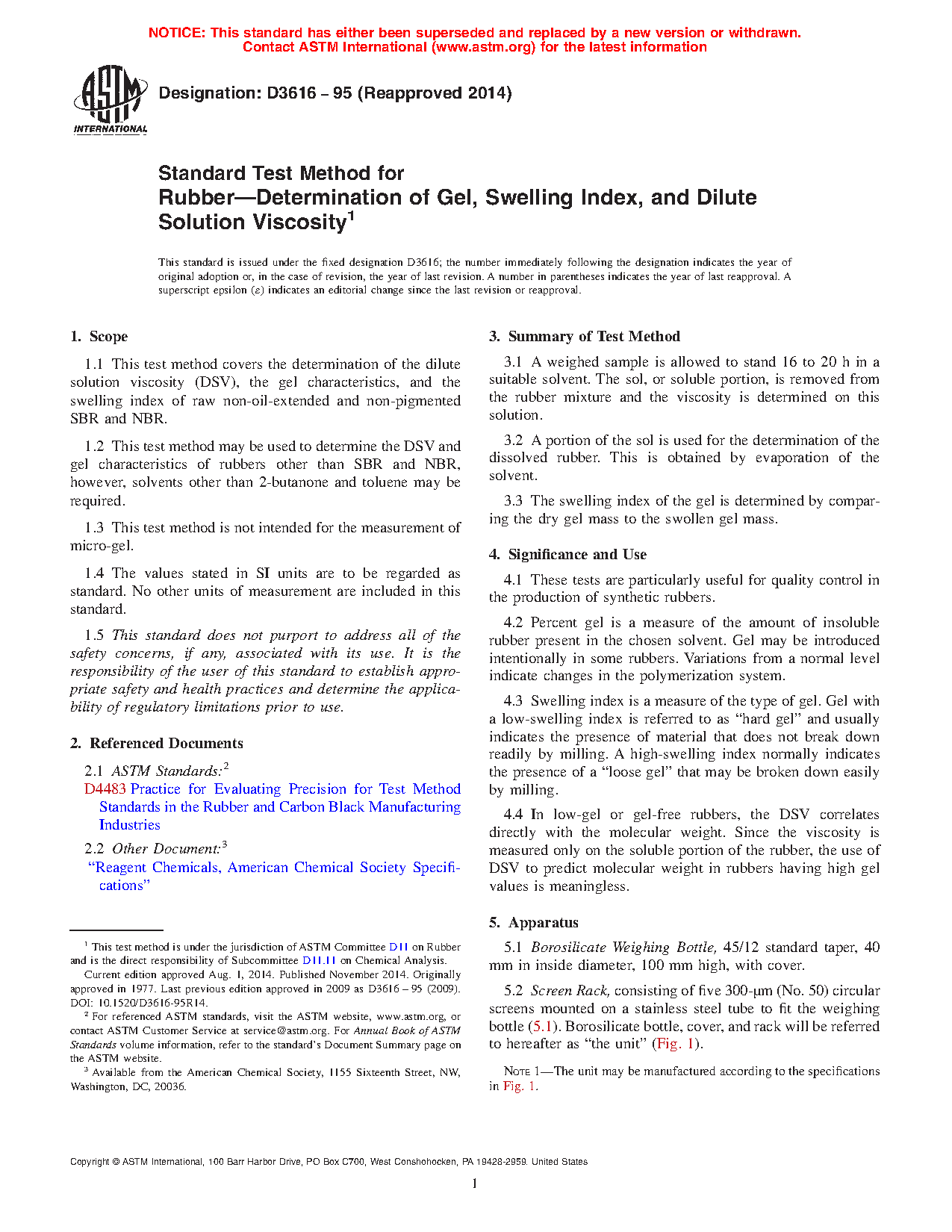 1.1 This test method covers the determination of the dilute solution viscosity (DSV), the gel characteristics, and the swelling index of raw non-oil-extended and non-pigmented SBR and NBR.