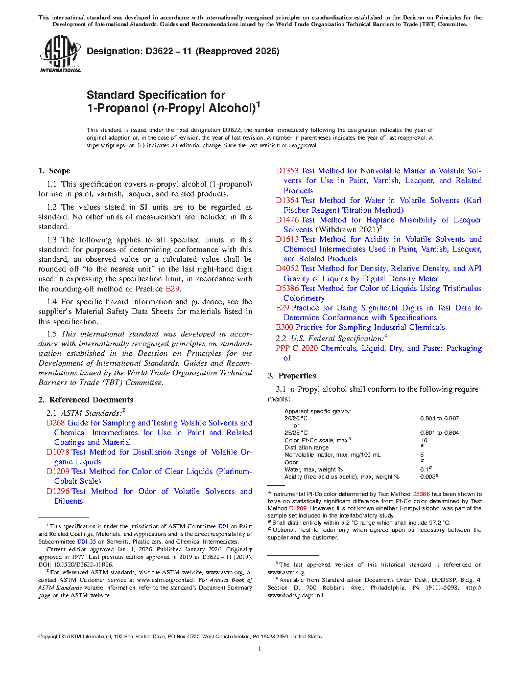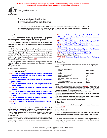 This specification covers n-propyl alcohol (1-propanol) volatile solvents for use in paints, varnishes, lacquers, and related products. The solvents should conform to the specified requirements for apparent specific gravity, color, distillation range, nonvolatile matter content, odor, water content, and acidity.
