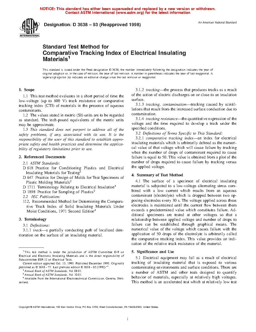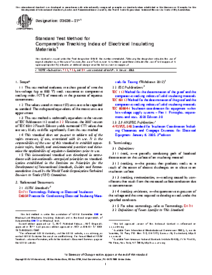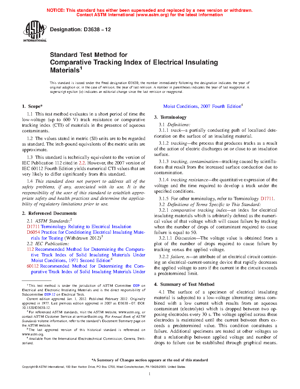 1.3 This test method is technically equivalent to the version of IEC Publication 112 cited in 2.2. However, the 2007 version of IEC 60112 Fourth Edition yields numerical CTI values that are very likely to differ significantly from this test method.