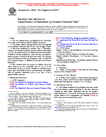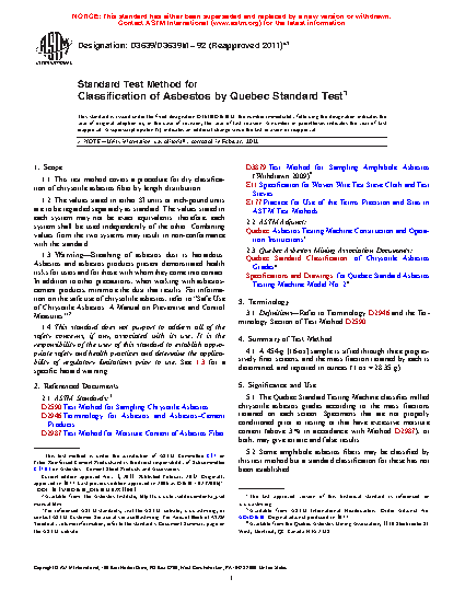The Quebec Standard Testing Machine classifies milled chrysotile asbestos grades according to the mass fractions retained on each screen. Specimens that are not properly conditioned prior to testing or that have excessive moisture content (above 3 % in accordance with Method D2987), or both, may give erratic and false results.
