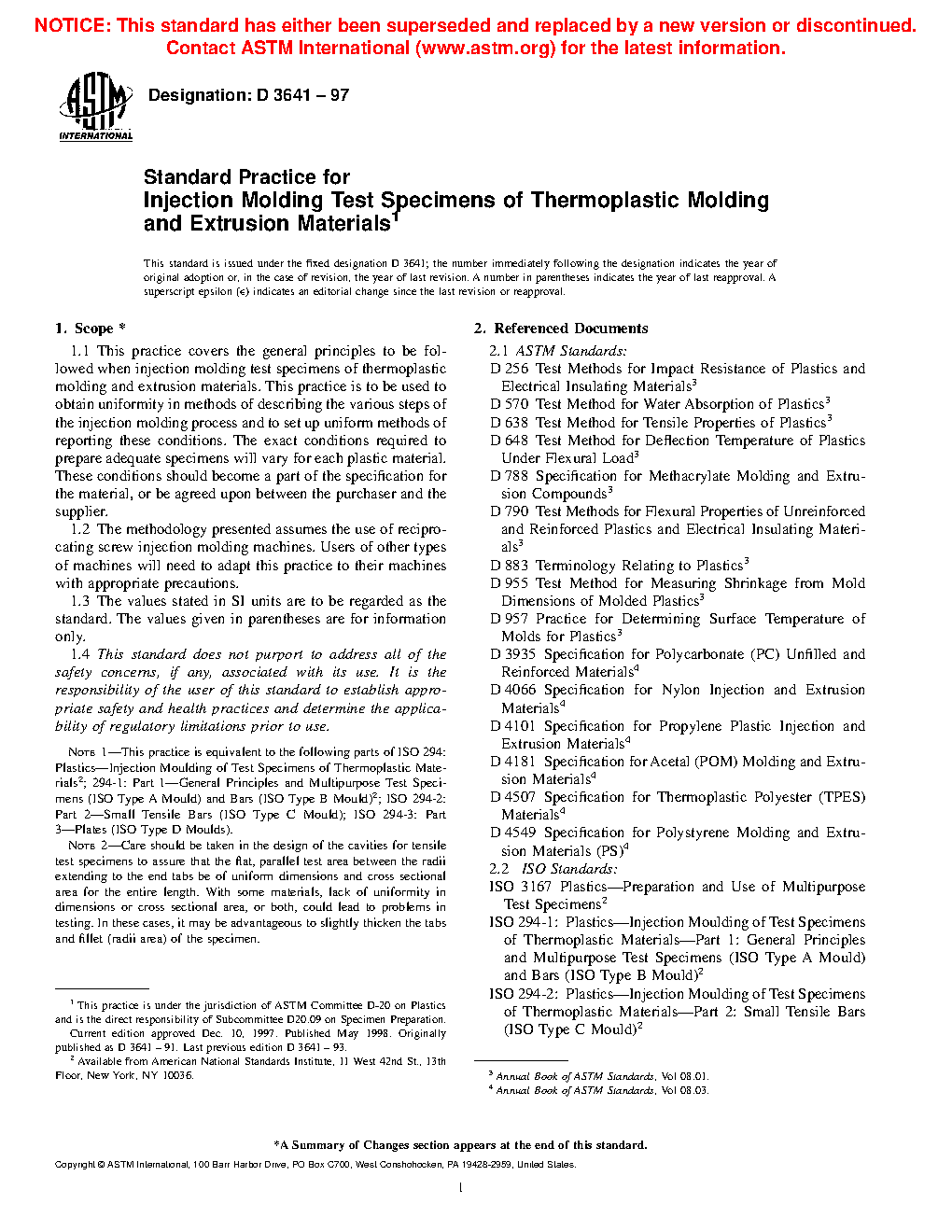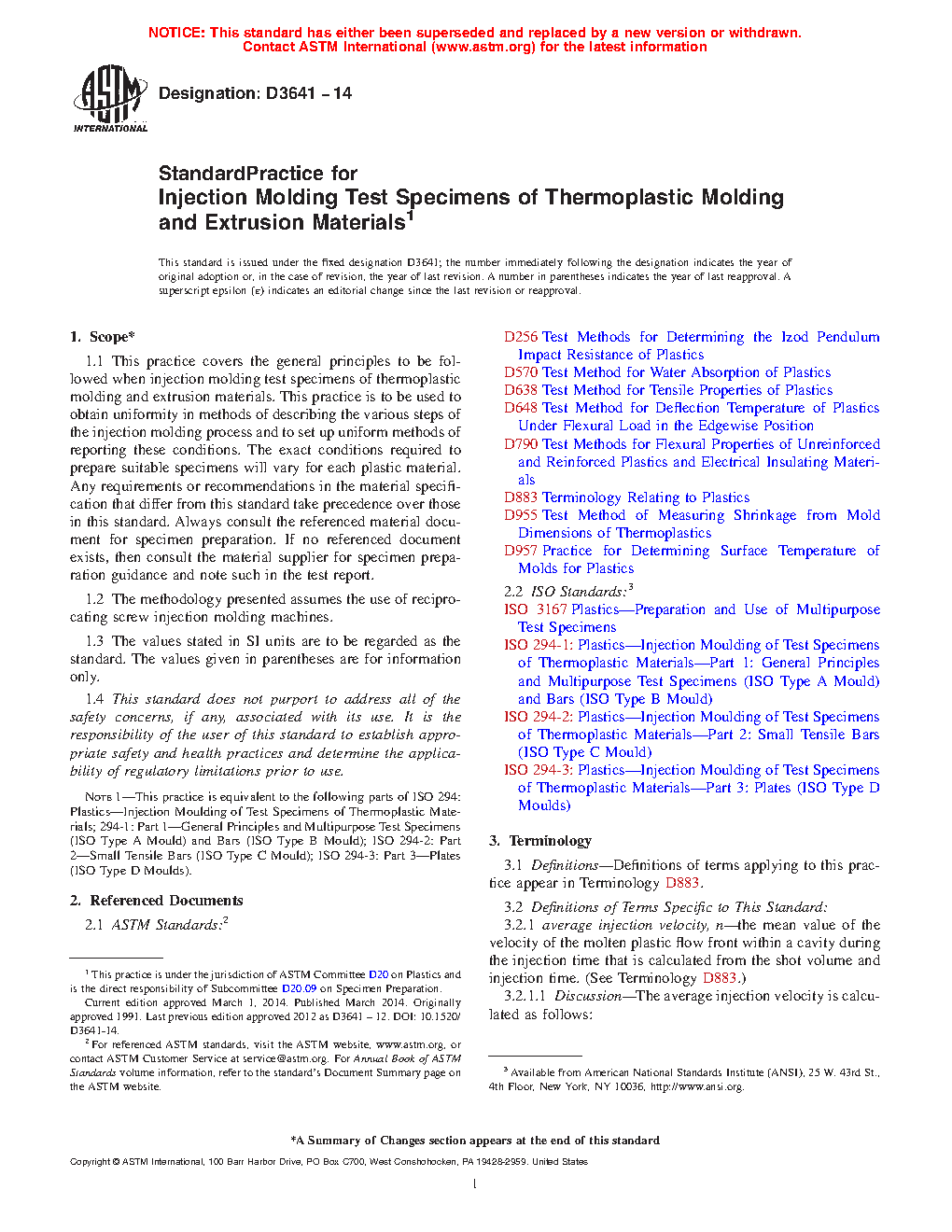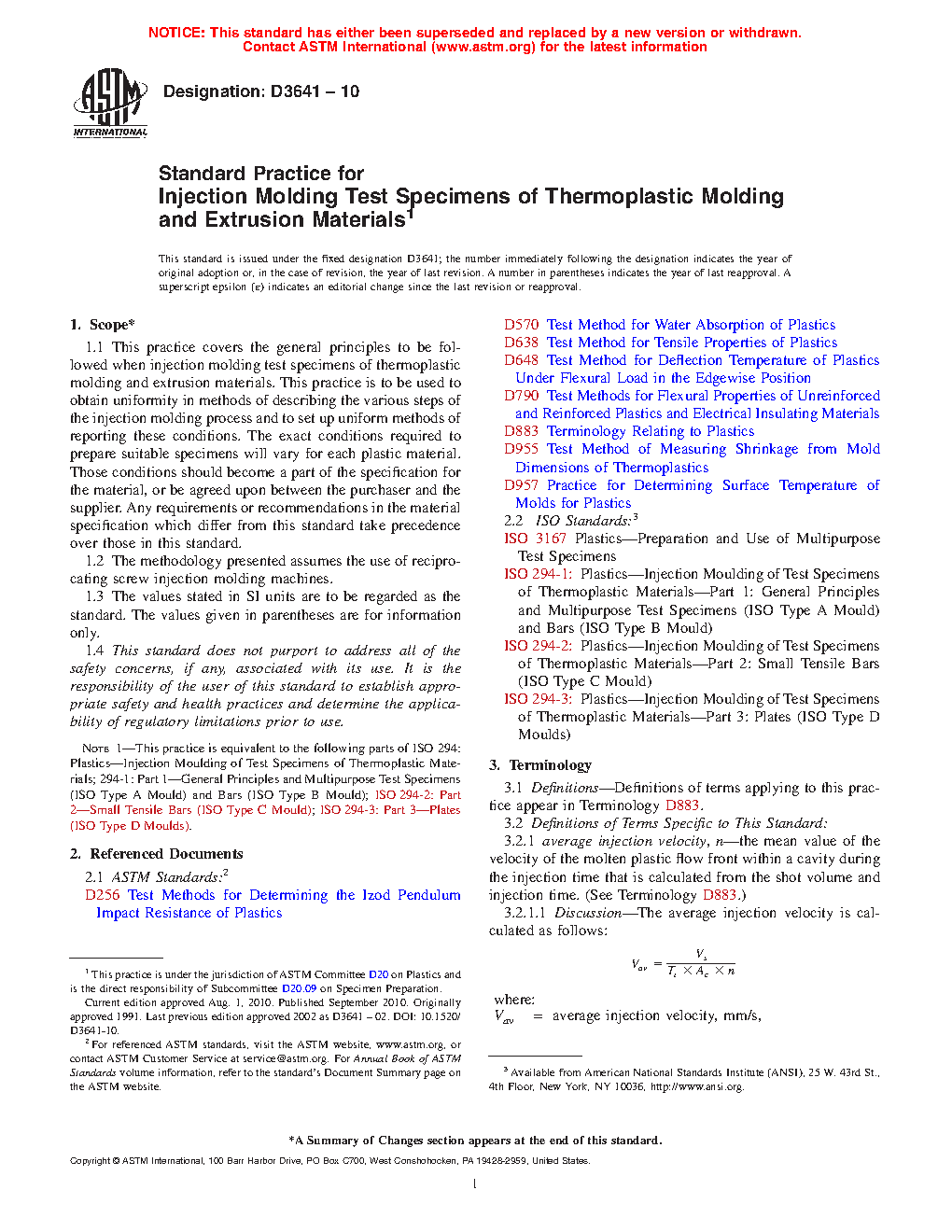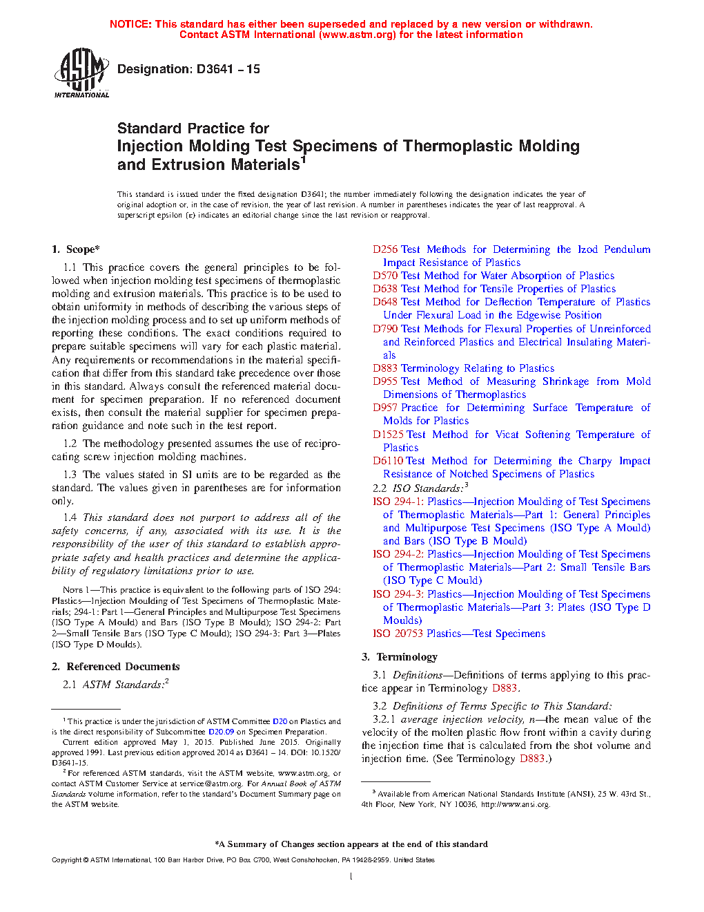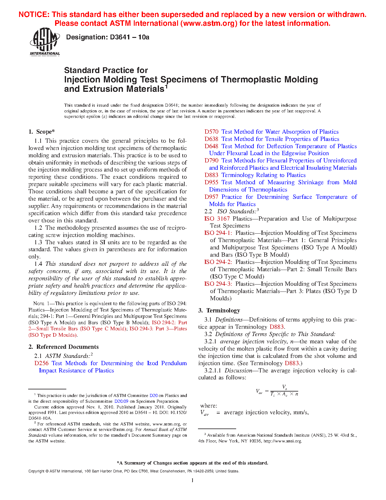 Note 1: This practice is equivalent to the following parts of ISO 294: Plastics—Injection Moulding of Test Specimens of Thermoplastic Materials; 294-1: Part 1—General Principles and Multipurpose Test Specimens (ISO Type A Mould) and Bars (ISO Type B Mould); ISO 294-2: Part 2—Small Tensile Bars (ISO Type C Mould); ISO 294-3: Part 3—Plates (ISO Type D Moulds).