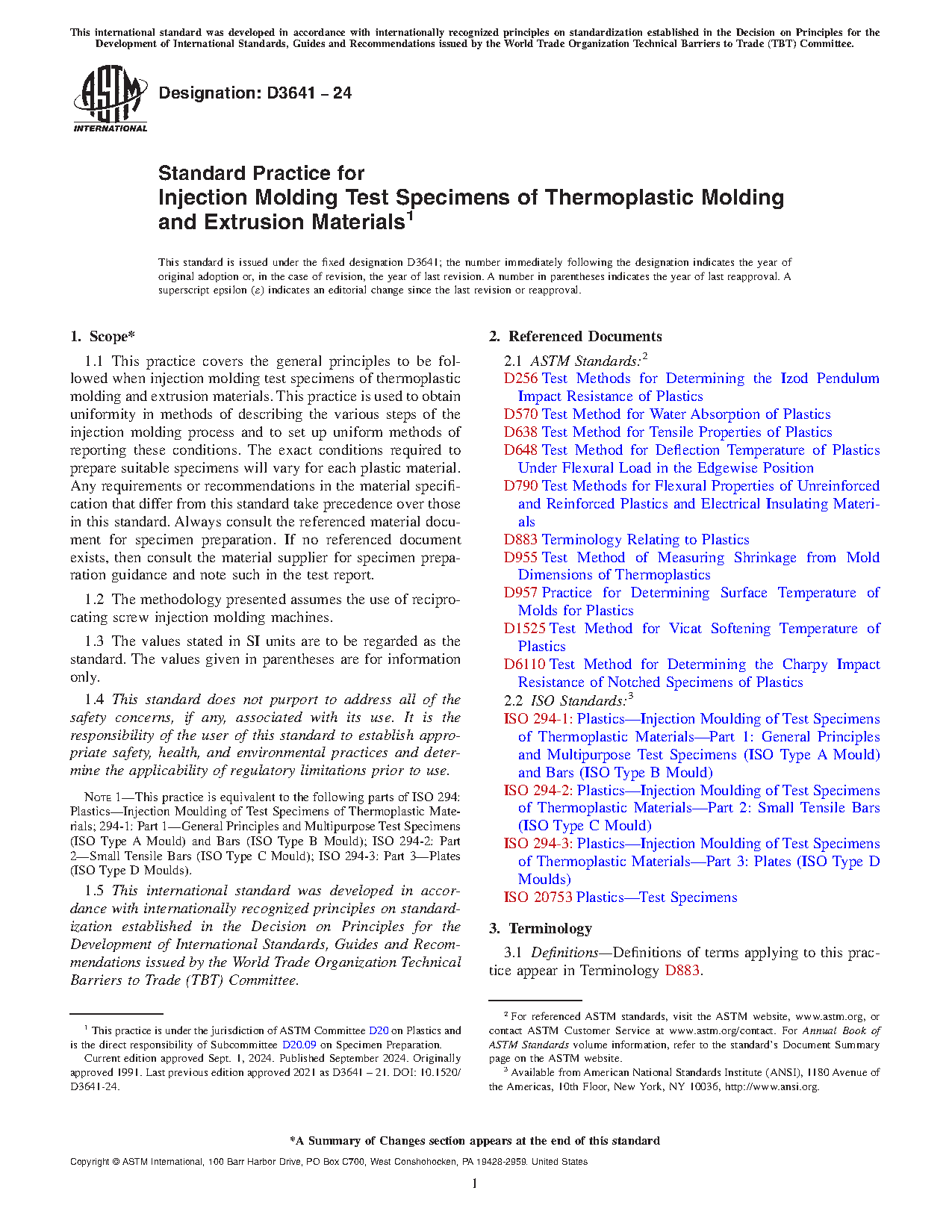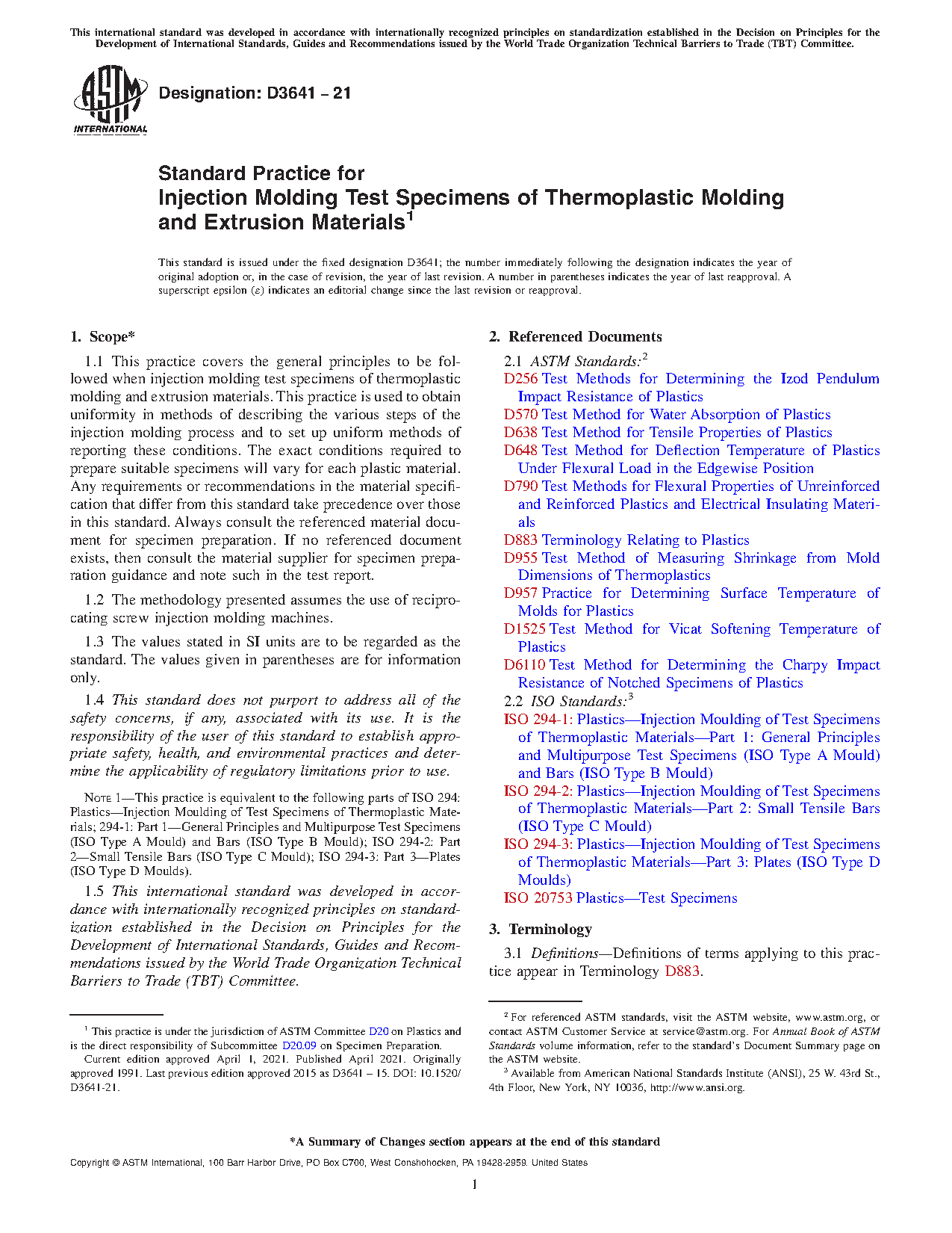 1.1 This practice covers the general principles to be followed when injection molding test specimens of thermoplastic molding and extrusion materials. This practice is used to obtain uniformity in methods of describing the various steps of the injection molding process and to set up uniform methods of reporting these conditions. The exact conditions required to prepare suitable specimens will vary for each plastic material. Any requirements or recommendations in the material specification that differ from this standard take precedence over those in this standard. Always consult the referenced material document for specimen preparation. If no referenced document exists, then consult the material supplier for specimen preparation guidance and note such in the test report.
