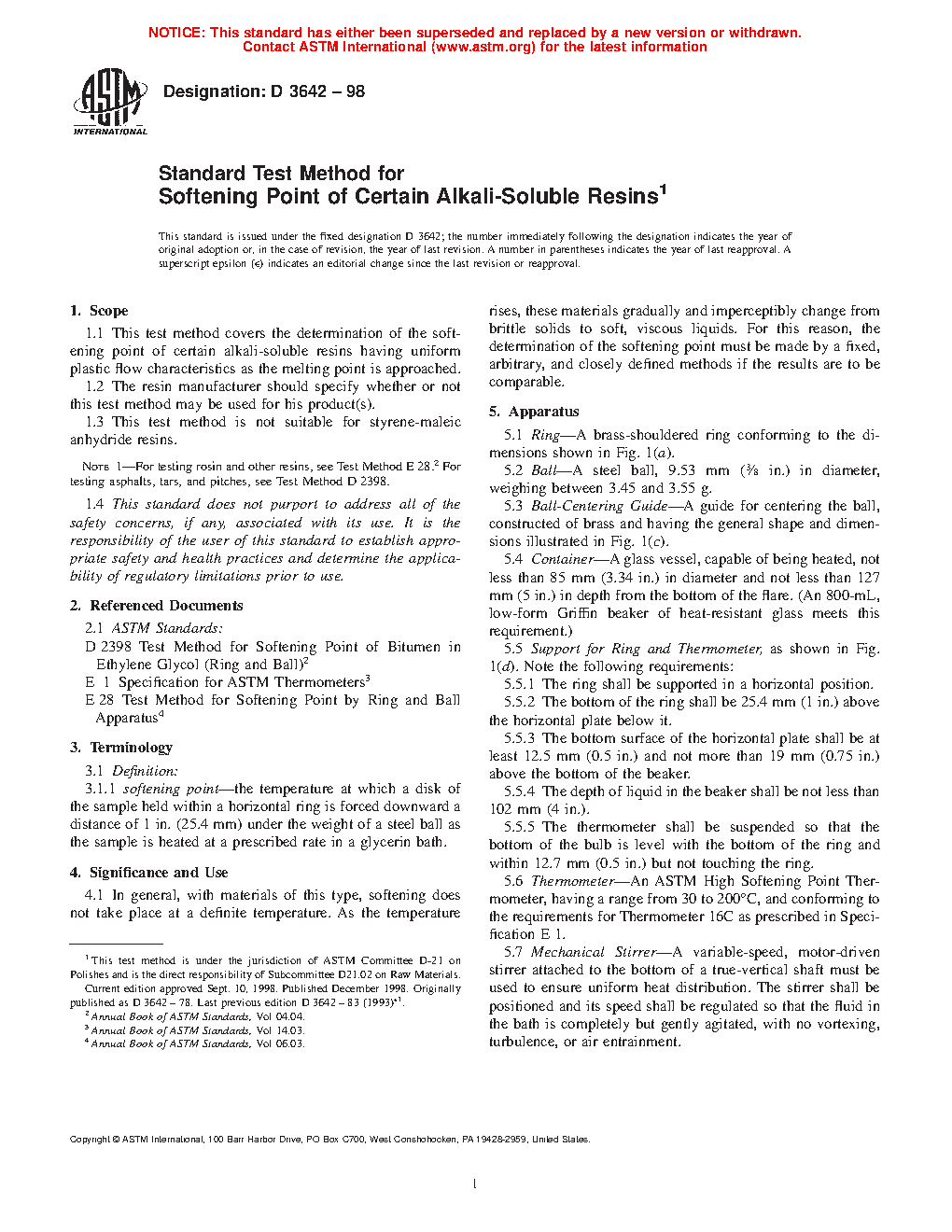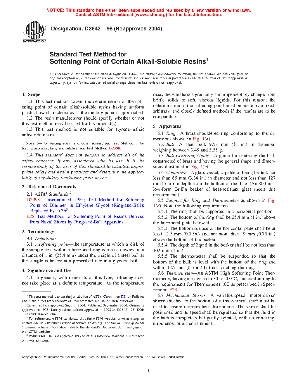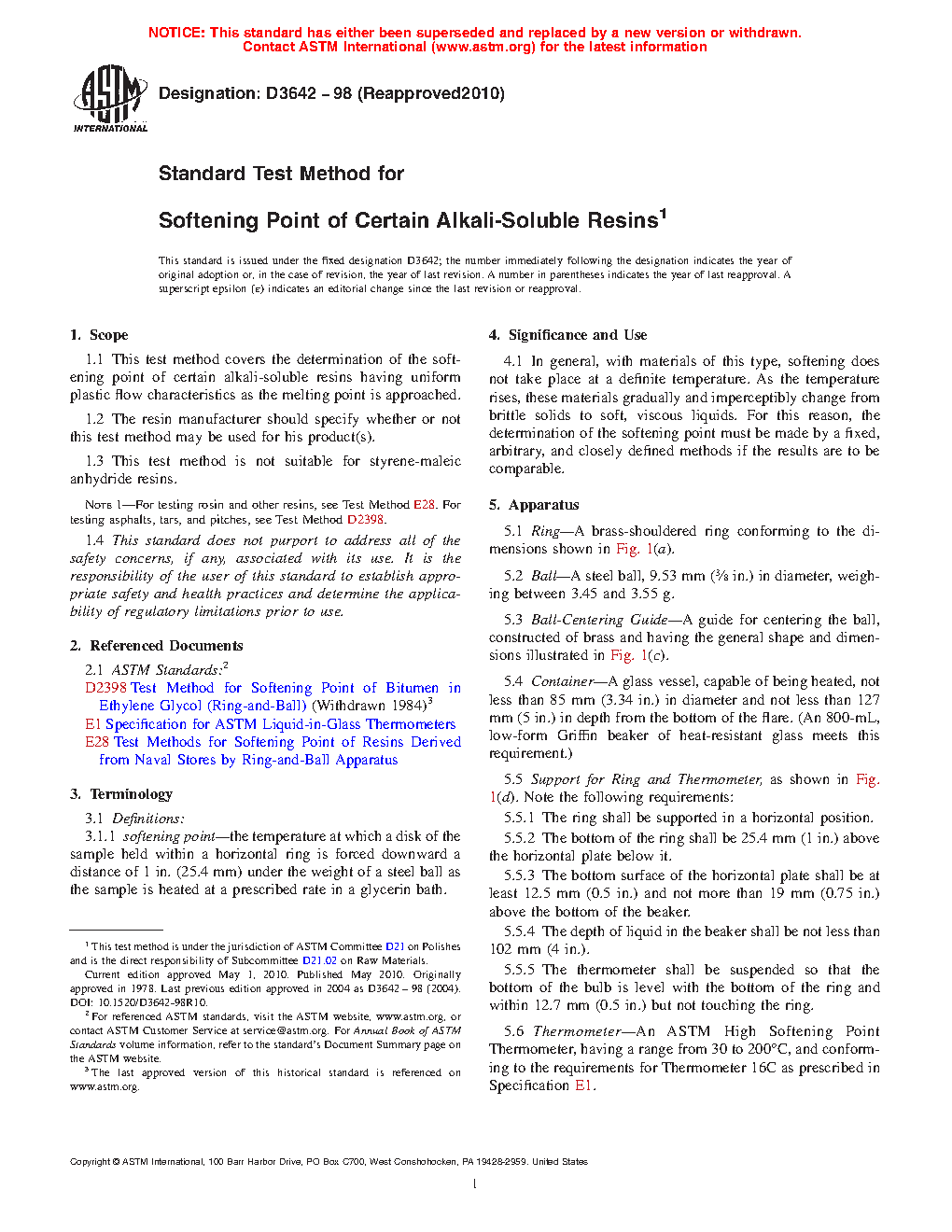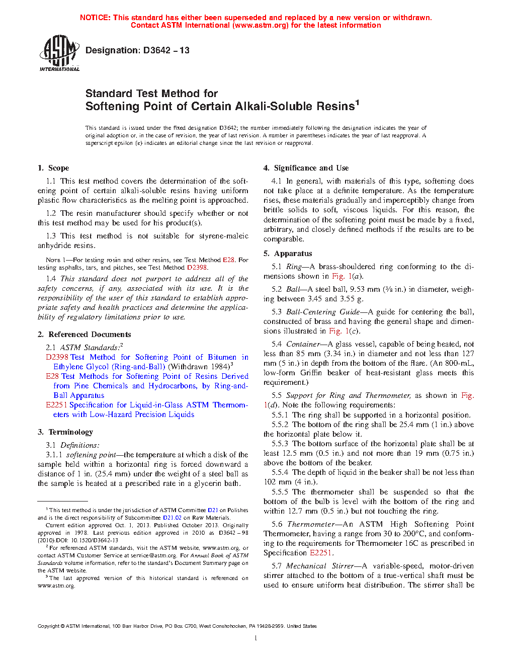 1.1 This test method covers the determination of the softening point of certain alkali-soluble resins having uniform plastic flow characteristics as the melting point is approached.