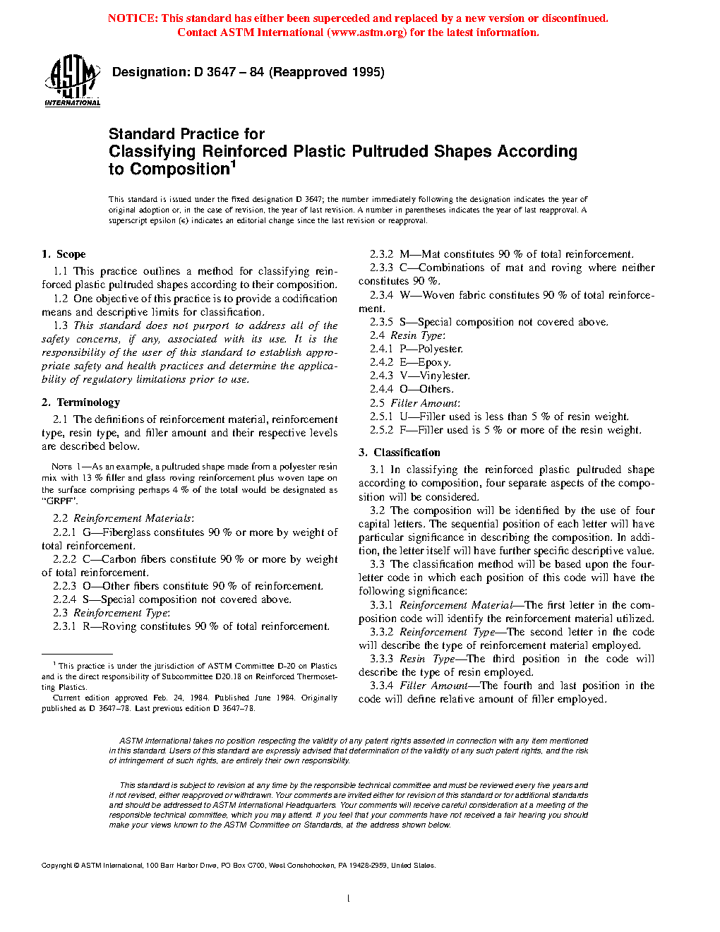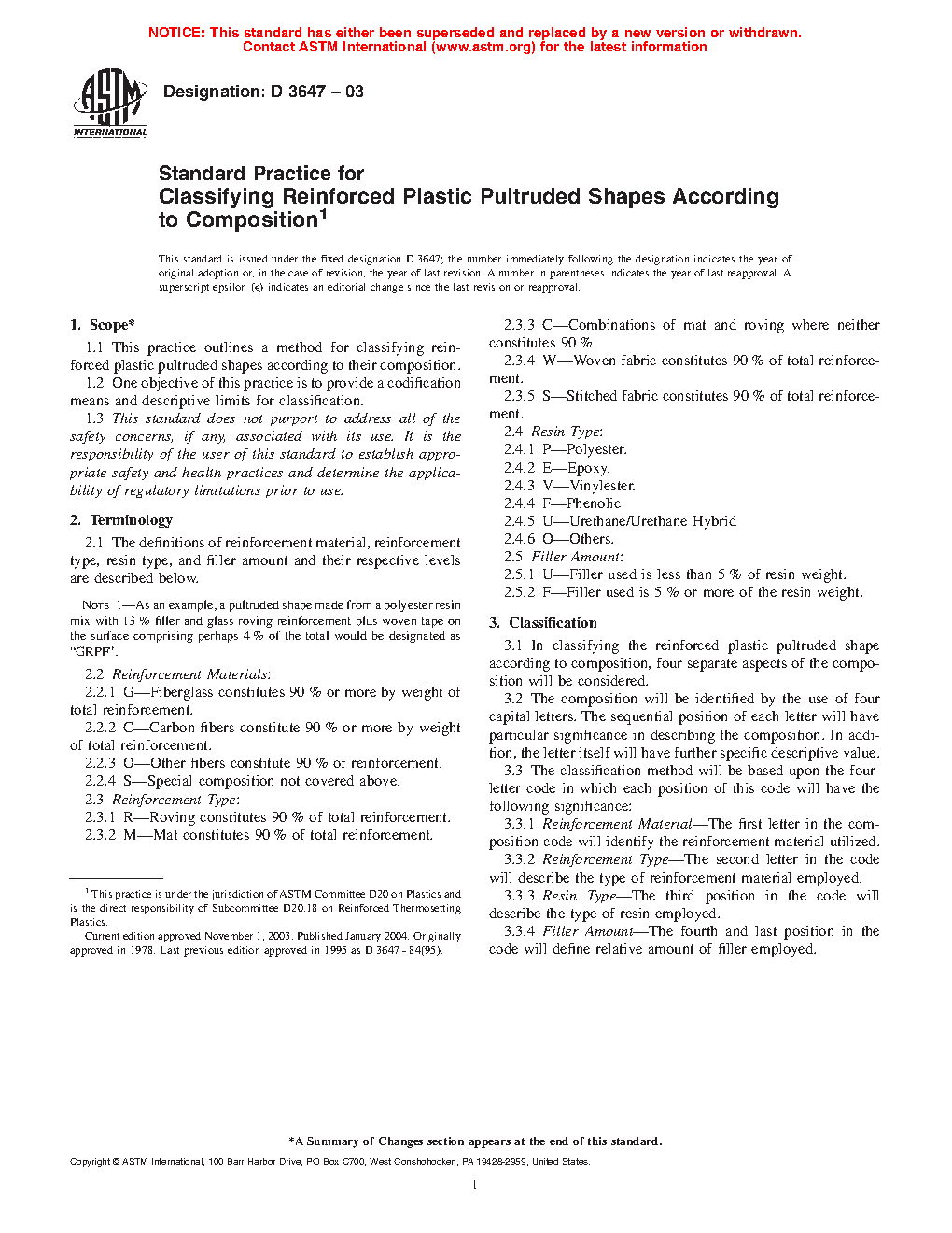 1.1 This practice outlines a method for classifying reinforced plastic pultruded shapes according to their composition.