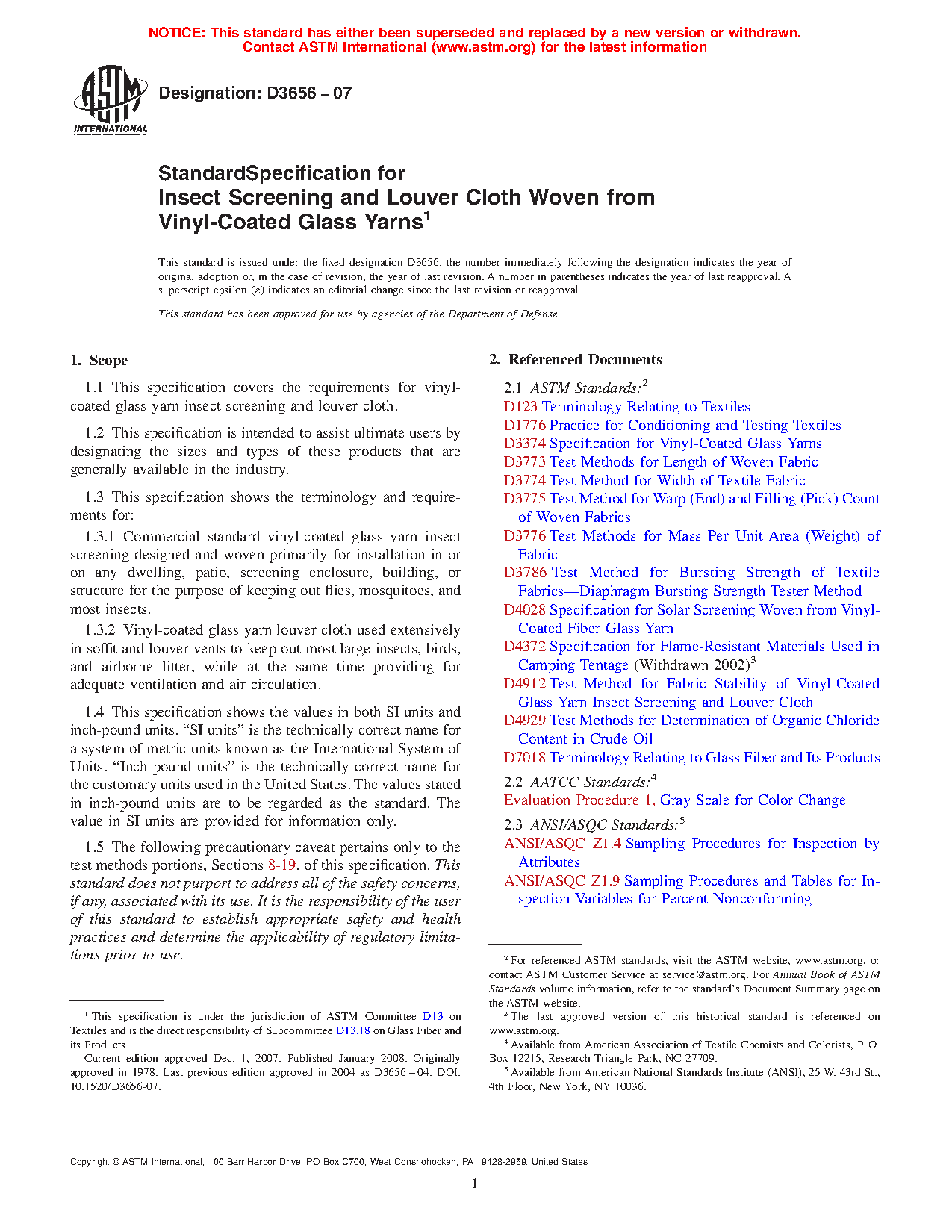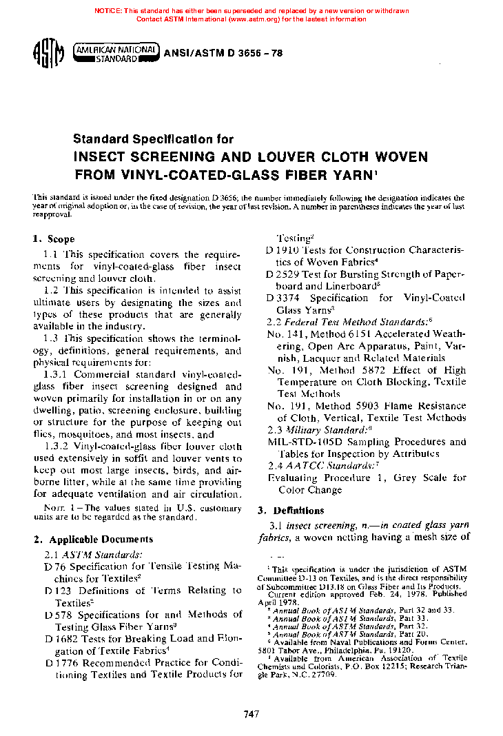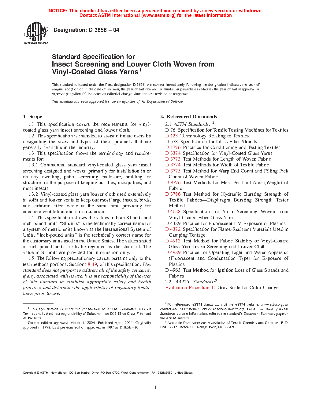 Standard Specification for Insect Screening And Louver Cloth Woven From Vinyl-Coated-Glass Fiber Yarn