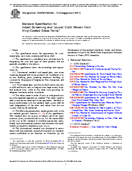 This specification covers the requirements for insect screening and louver cloth made from vinyl-coated glass yarns. Specifically covered here are: commercial standard vinyl-coated glass yarn insect screening designed and woven primarily for installation in or on any dwelling, patio, screening enclosure, building, or structure for the purpose of keeping out flies, mosquitoes, and most insects; and vinyl-coated glass yarn louver cloth used extensively in soffit and louver vents to keep out most large insects, birds, and airborne litter, while at the same time providing for adequate ventilation and air circulation. Products are produced in two basic classes (Classes 1 and 2) based on nominal thickness. Products shall be suitably tested and conform accordingly to specified requirements in tems of appearance, mesh, roll length, mass per unit area, flame resistance, fabric stability, bursting strength, stiffness index, and color stability to accelerated weathering.