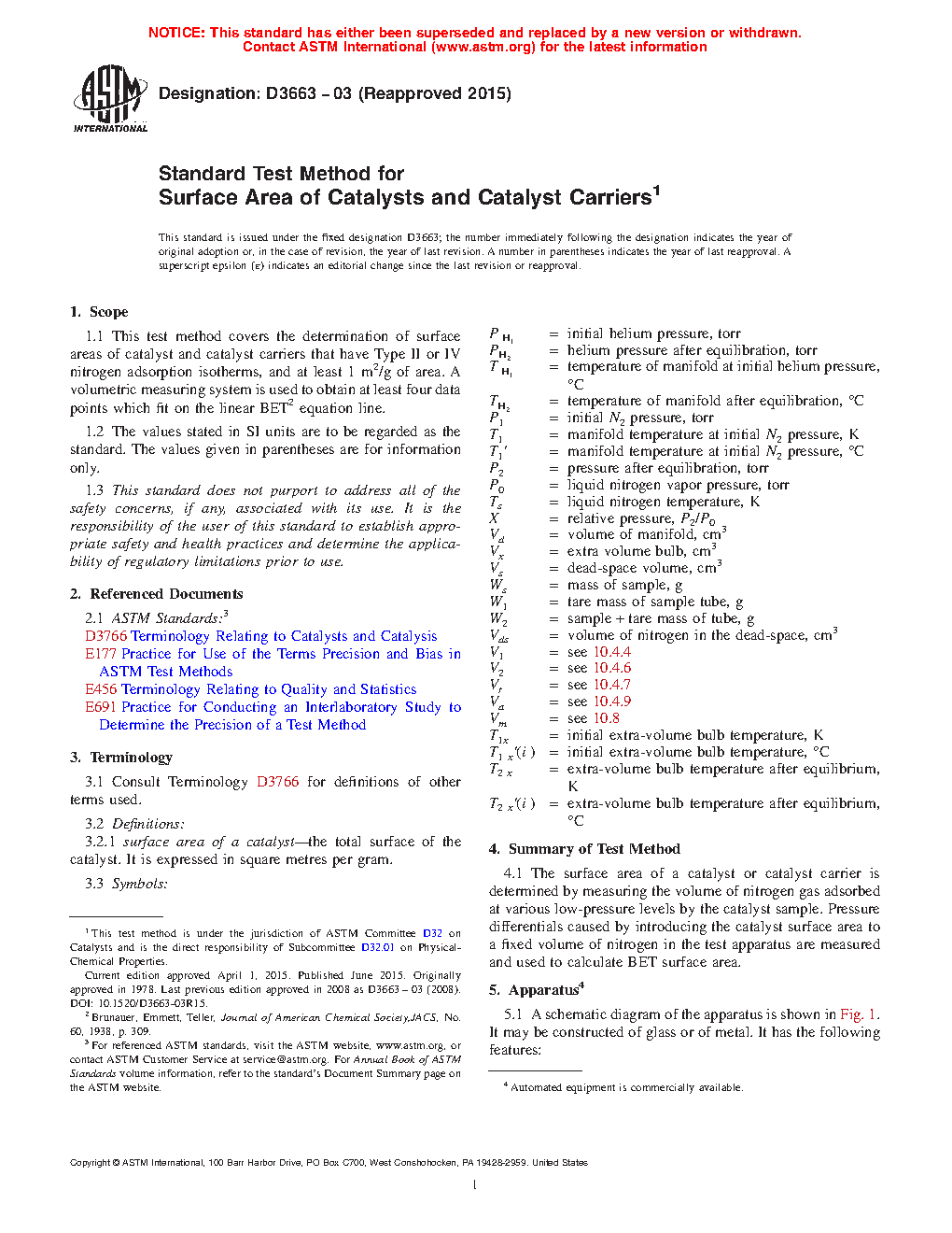 This test method establishes the standard procedure for determining the surface areas of catalyst and catalyst carriers that have Type II or IV nitrogen adsorption isotherms, and specified minimum area. A volumetric measuring system is used to obtain at least four data points which fit on the linear BET line. The surface area of a catalyst or catalyst carrier is determined by measuring the volume of nitrogen gas adsorbed at various low-pressure levels by the catalyst sample. Pressure differentials caused by introducing the catalyst surface area to a fixed volume of nitrogen in the test apparatus are measured and used to calculate BET surface area.