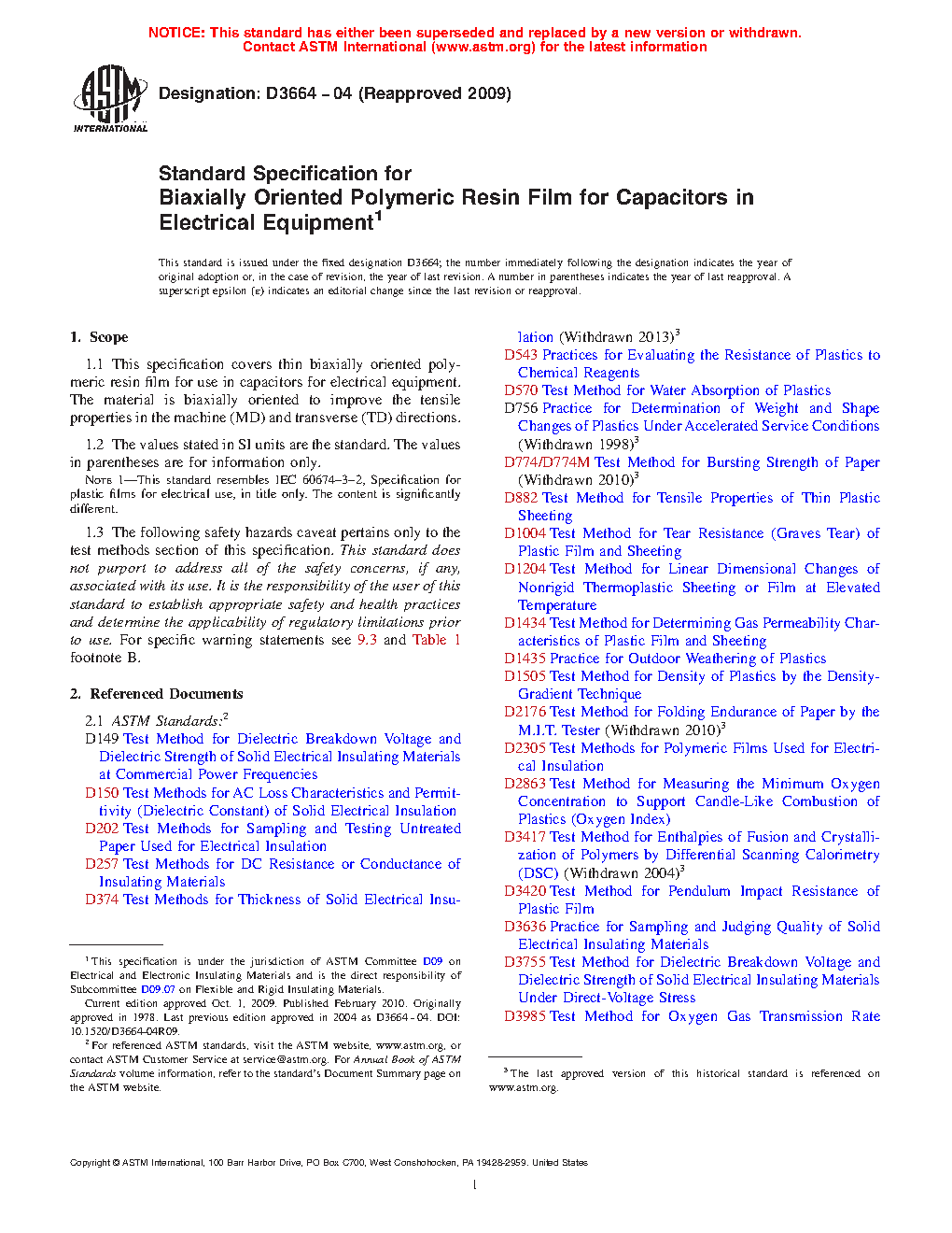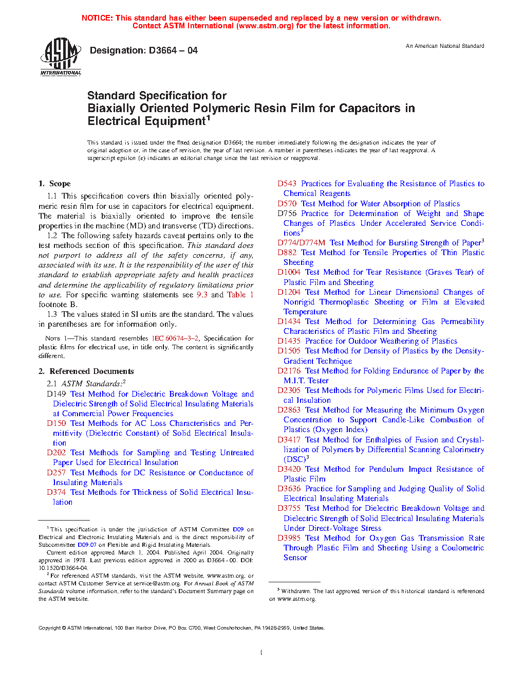 1.1 This specification covers thin biaxially oriented polymeric resin film for use in capacitors for electrical equipment. The material is biaxially oriented to improve the tensile properties in the machine (MD) and transverse (TD) directions.