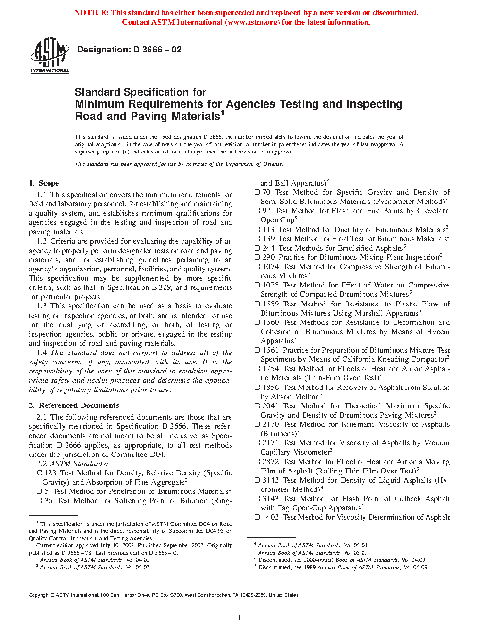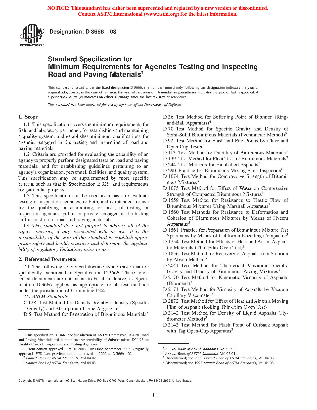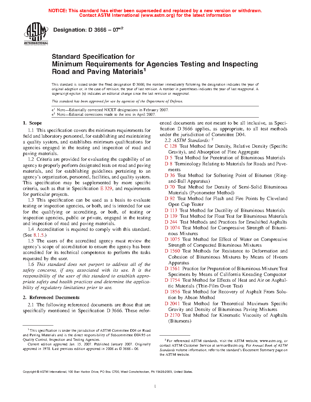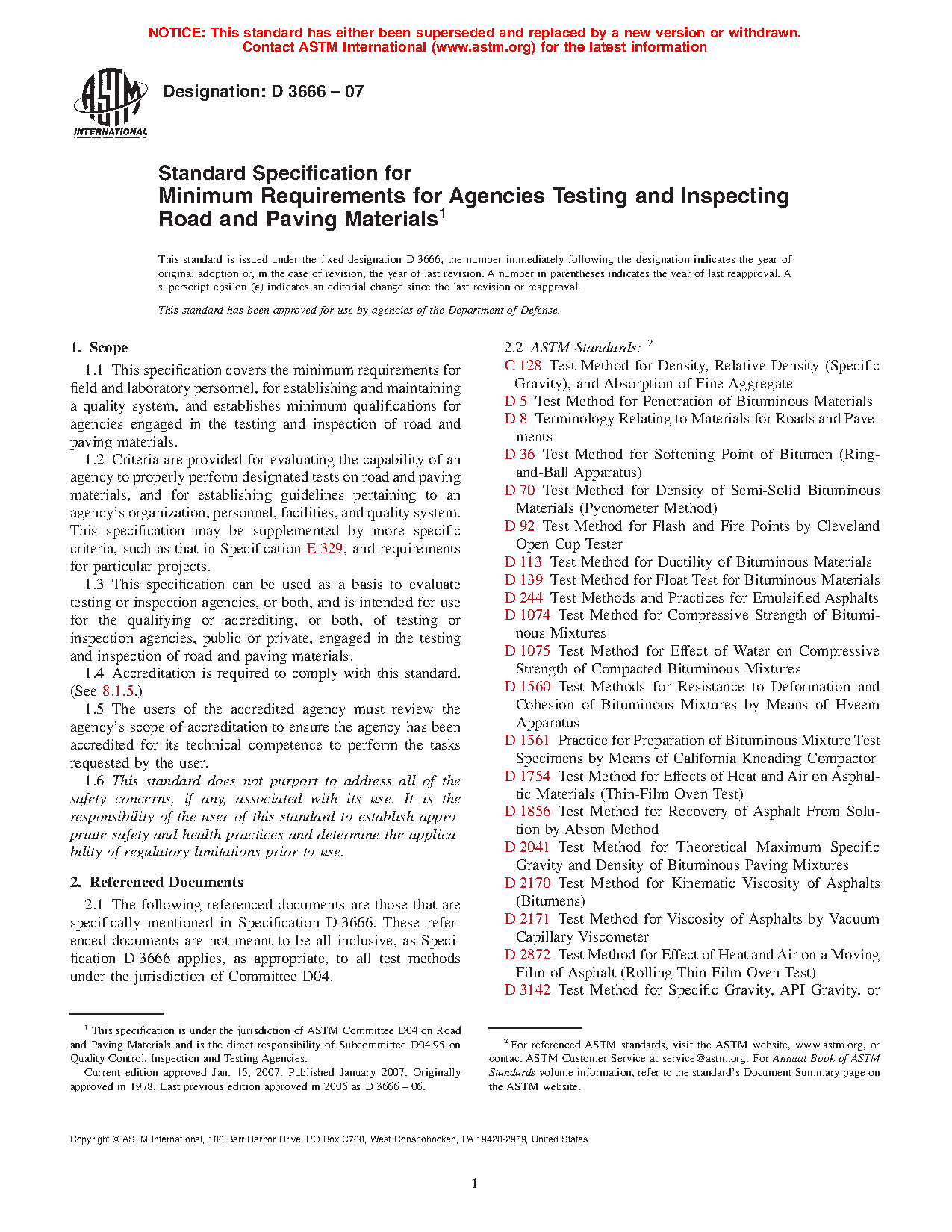 1.1 This specification covers the minimum requirements for field and laboratory personnel, for establishing and maintaining a quality system, and establishes minimum qualifications for agencies engaged in the testing and inspection of road and paving materials.